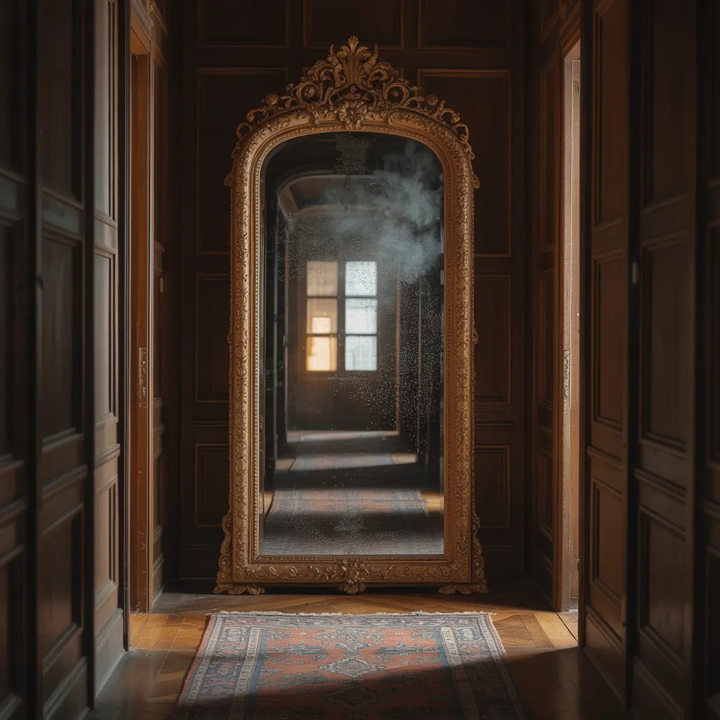An ornate gilded mirror with an intricate carved wood frame dominates the foreground, reflecting a dimly lit hallway stretching into the distance. The image exudes an air of faded grandeur, with rich wood paneling lining the walls and a patterned antique rug runner guiding the eye through the corridor. Wisps of dust particles dance in the shafts of light filtering through unseen windows, lending an atmospheric, almost haunting quality. The color palette is muted yet warm, with deep browns, burnished gold accents, and hints of terracotta from the rug’s design. This traditional, old-world interior showcases the opulent materials and craftsmanship of a bygone era, offering a glimpse into a stately, historic residence.