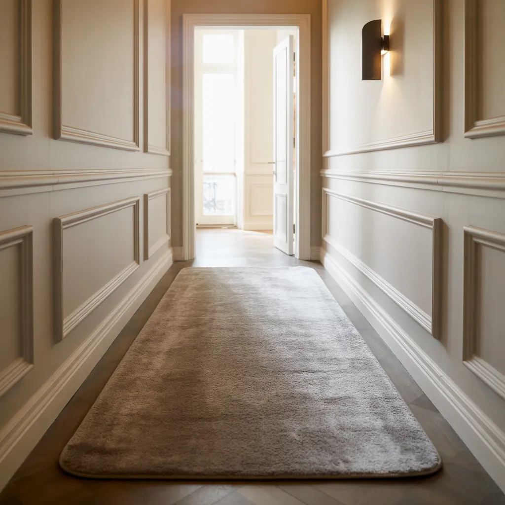 A long, plush carpet runner in shades of tan and gray dominates this elegant hallway, guiding the eye toward the bright, airy French door at its end. The door frames provide a glimpse of the outdoors beyond. Wainscoting panels in a creamy white line the lower walls, topped by subtly molded trim that creates visual interest. Recessed lighting and minimalist sconces complete the contemporary design, bathing the space in warm, inviting illumination. The cohesive color palette of whites, tans and grays conveys a sense of understated luxury, while the natural textures like wood and fabric soften the linear aesthetic.