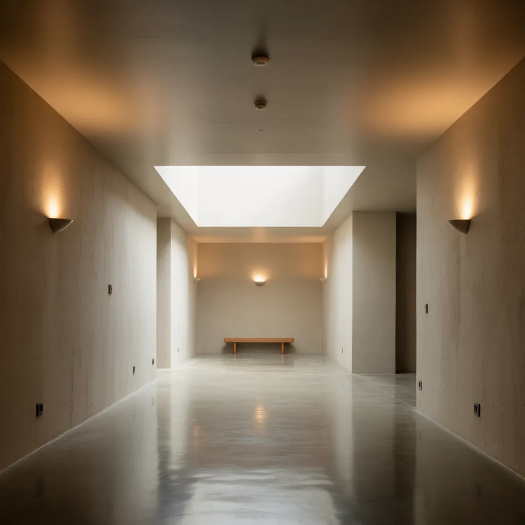 A long, minimalist hallway with an airy skylight pouring in natural light. Warm hues emanate from the cream-colored walls and recessed ceiling lights, casting a cozy glow. Oak benches provide sleek seating niches, complemented by sconces emitting diffused illumination. The polished concrete floor reflects the light sources, creating a bright yet intimate ambiance. Simplicity reigns in this modern, zen space where clean lines and natural materials like wood and concrete converge harmoniously with strategic lighting design to shape a serene passageway.
