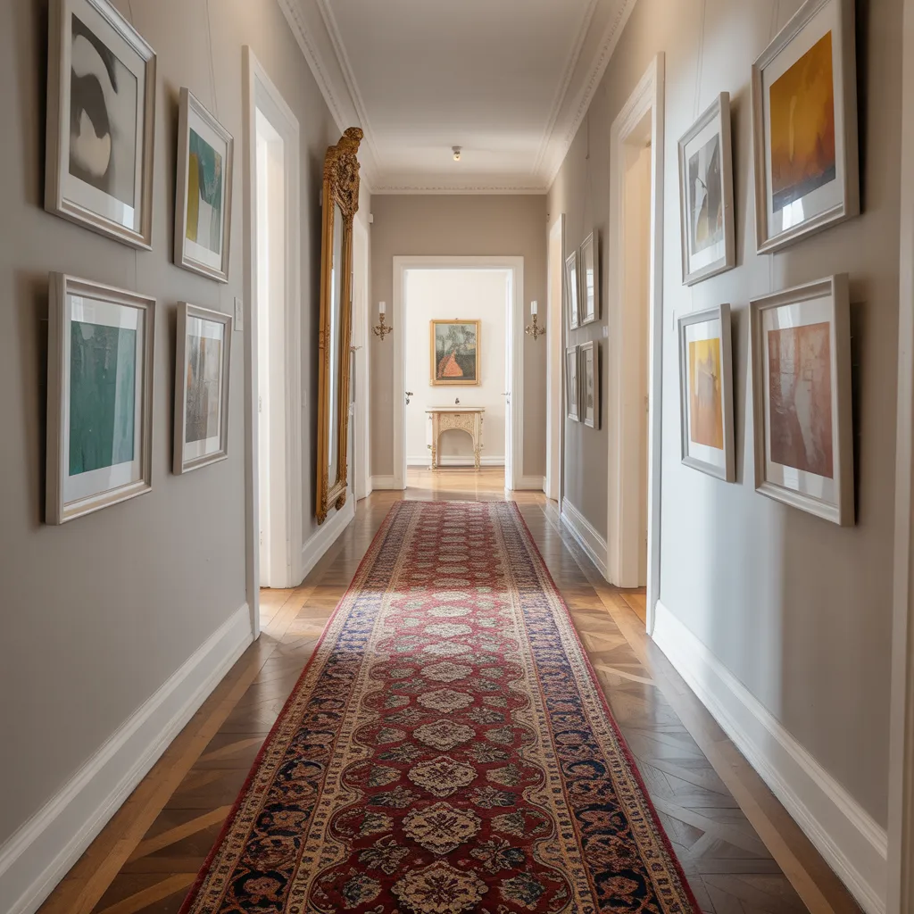 A long hallway stretches out, its walls adorned with framed artwork in varying shades of grey, green, yellow, and brown, creating a curated gallery-like atmosphere. An ornate gilded mirror stands tall, reflecting the warm tones of the patterned runner that guides the eye toward an inviting living area at the end. The classic interior exudes an elegant transitional style, with wood floors, paneled walls, and carefully chosen materials like framed artwork and an antique rug hinting at the refined living spaces ahead. The muted color palette of neutrals and rich earth tones establishes a cohesive, sophisticated ambiance that piques curiosity about the rooms to be discovered.