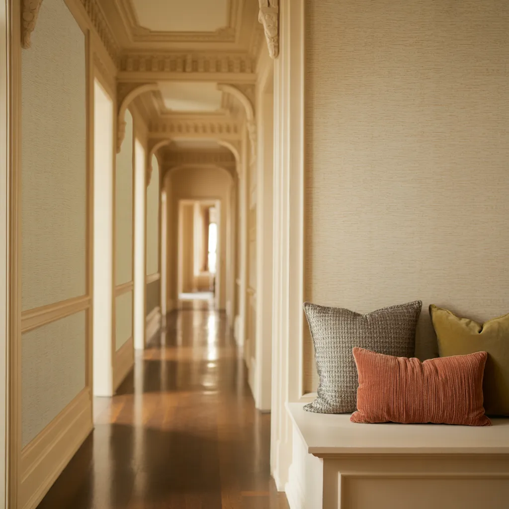 A long hallway stretches into the distance, its arched ceilings and symmetrical design exuding classical elegance. Warm beige tones envelop the space, punctuated by crisp white millwork framing each archway. Plush grey and terracotta pillows adorn a built-in window seat, inviting quiet moments of respite. The traditional hall epitomizes refined European aesthetics through its ornate moldings, rich hardwood floors, and subtly textured walls. A soft light filters in from an unseen source, casting an inviting glow that enhances the hall’s serene ambiance.