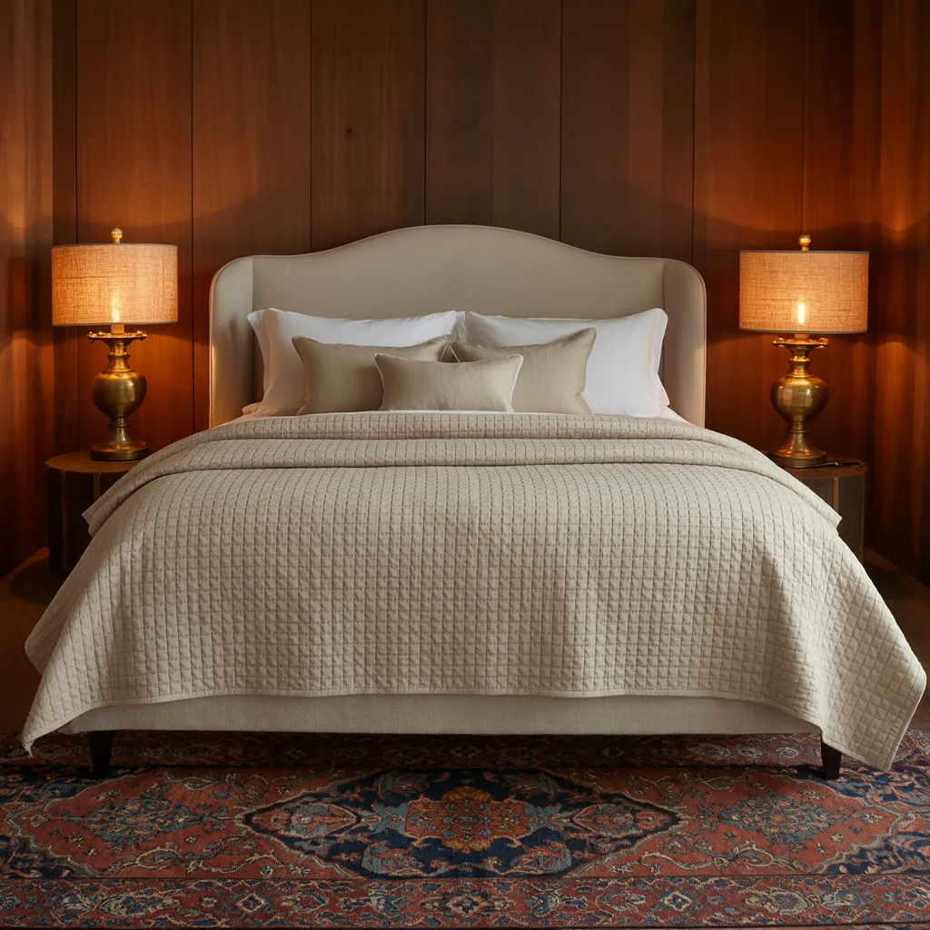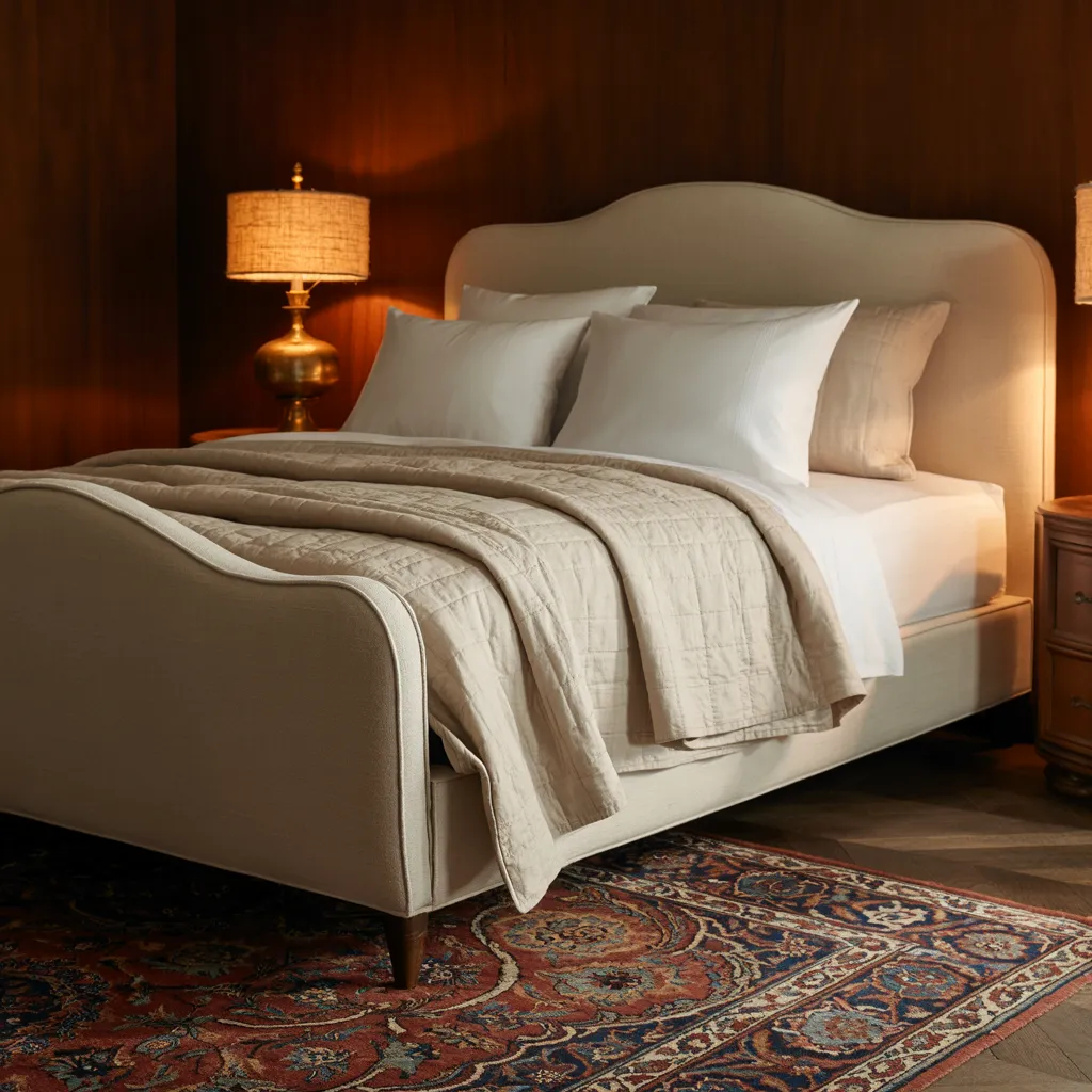 A luxurious upholstered bed takes center stage, adorned with creamy linens and a tailored quilt in soft beige tones. Crisp white pillows add textural depth against the curved headboard’s neutral hue. Vintage brass lamps with burlap shades emit a warm, cozy glow, while an ornate Persian rug anchors the space with its rich burgundy, navy, and earth-toned patterns. The soothing palette of warm browns and creamy neutrals exudes timeless sophistication, anchored by wood-paneled walls for an enveloping, grounded ambiance – a refined take on 1970s-inspired earthy tones accented by plush textiles and metallic touches.