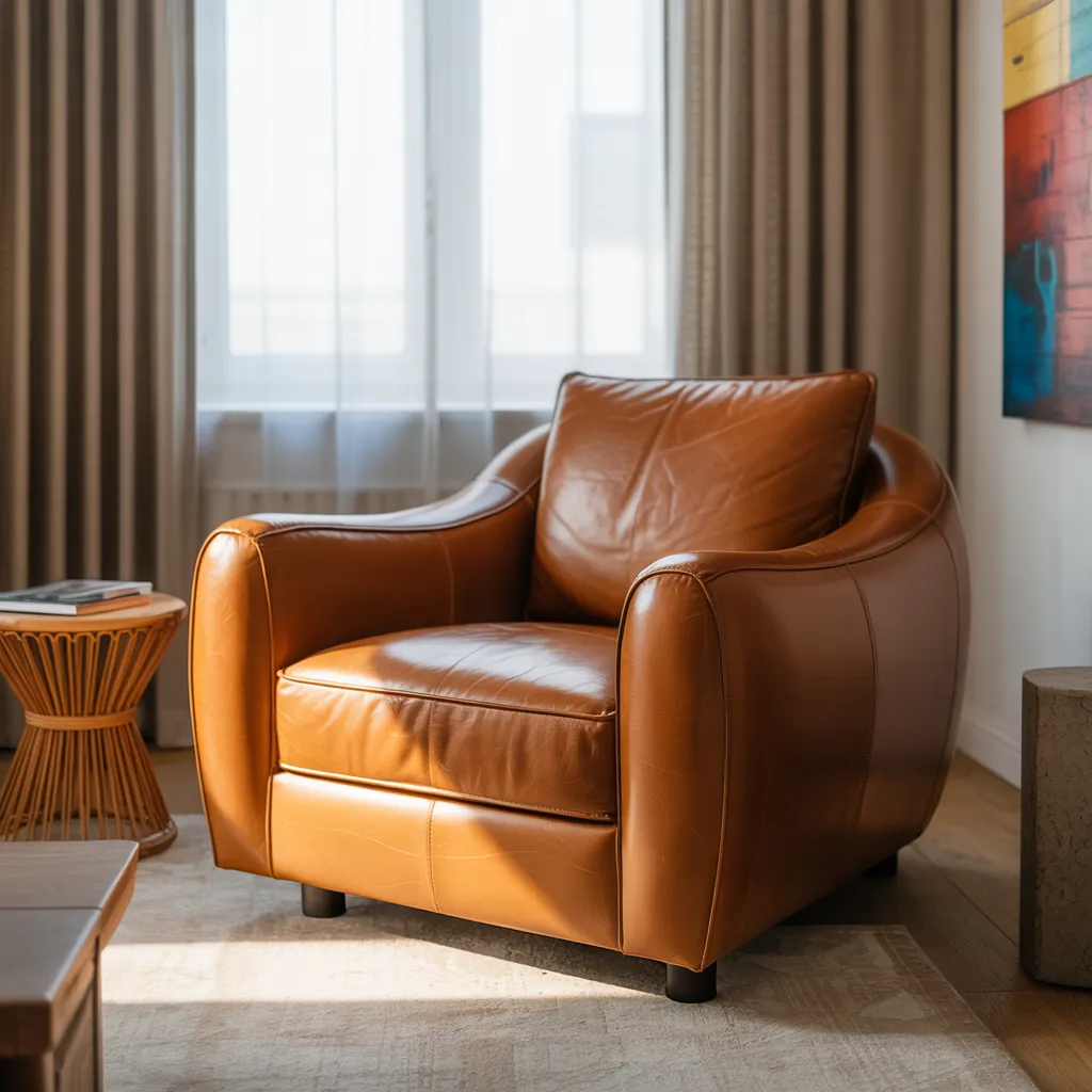 A luxurious leather armchair in rich caramel tones takes center stage, exuding warmth and sophistication. This contemporary interior showcases a harmonious blend of earth-toned hues, with neutral beige curtains providing a soft backdrop for the deep ochre accents. The room’s focal point is the sumptuous leather upholstery, complemented by wooden furnishings in warm, natural tones. A vibrant abstract artwork adds a vivid pop of color, while intricate rattan side tables introduce textural appeal. The overall ambiance is one of inviting comfort and modern elegance, skillfully layered with organic materials and an earthy, enveloping color palette.