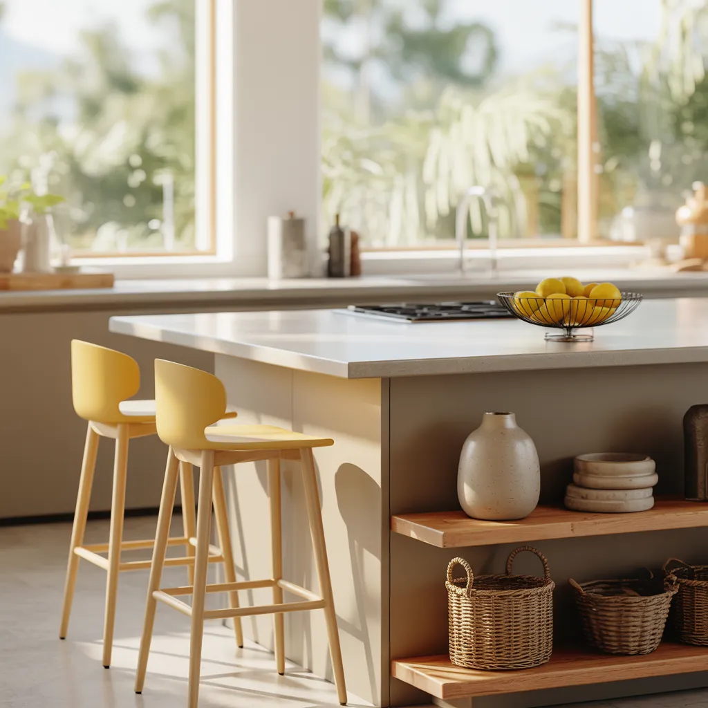 Sleek gray cabinets dominate this airy kitchen, exuding a serene and understated elegance. Natural light streams through expansive windows, casting a warm glow over the minimalist space. The clean lines and muted tones reflect a distinctly contemporary style. Smooth stone countertops and warm wood accents provide an organic contrast to the cool gray palette. Woven baskets and ceramic vases on open shelving add textural interest. Golden yellow bar stools and a bowl of lemons punctuate the neutral backdrop with vibrant pops of sunshine, breathing life into the calming, restorative ambiance.