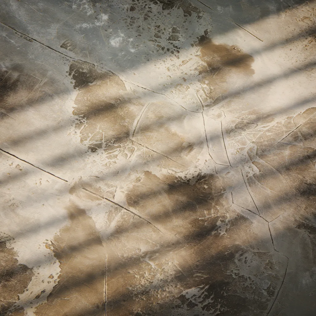 A close-up view of an aged concrete surface showcasing a naturally developed patina. The material displays a blend of gray and warm beige tones, with subtle variations in texture and faint cracks that highlight its weathered character. Soft shadows fall across the surface, adding depth and emphasizing the tactile quality of the concrete. The finish appears matte and slightly rough, illustrating the organic aging process of the material.