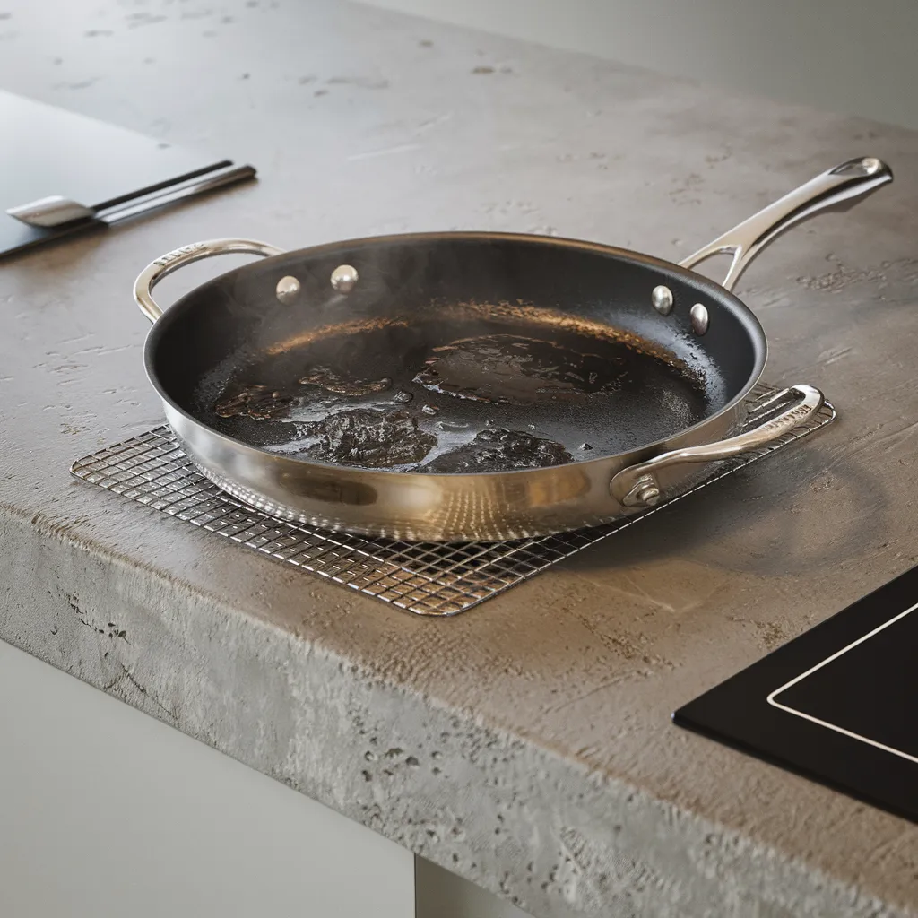 A view of a modern kitchen countertop demonstrates concrete’s impressive heat resistance. A stainless steel pan rests on a trivet, emphasizing the importance of protecting the sealed surface from direct high heat. The raw, textured finish of the concrete contrasts elegantly with the sleek metal and glass elements, reflecting a balance between durability and refined design.