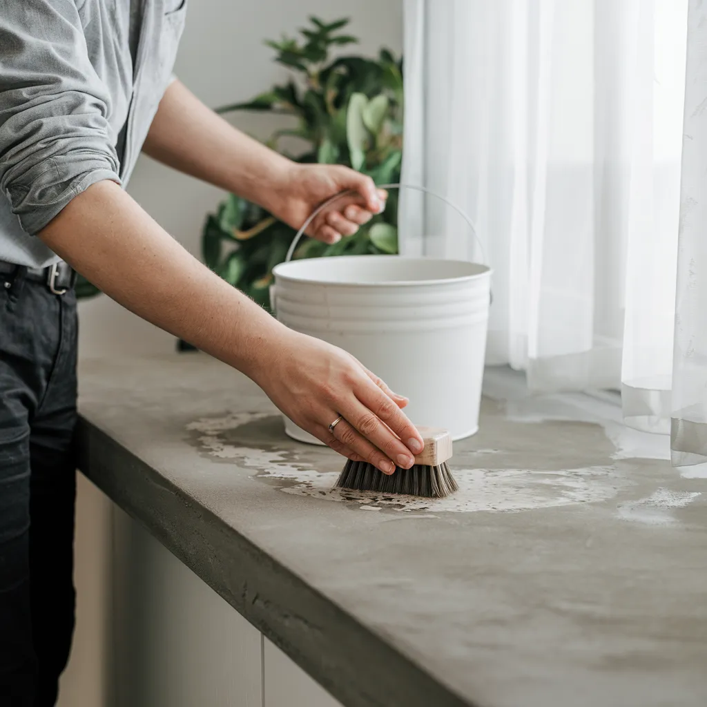 A person gently cleans a smooth concrete countertop, representing the simple maintenance routine that keeps the material looking its best. Using mild soap, water, and a soft brush, the surface is cared for without harsh abrasives. Natural light floods the scene, highlighting the countertop’s understated elegance and reinforcing the idea that proper daily care allows concrete to age beautifully over time.