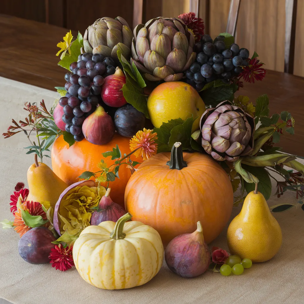 Sun-kissed pumpkins, plump figs, vibrant plums, and lush grapes cascade across a rustic wooden table, an abundant autumnal bounty. Earthy artichokes and smooth pears lend organic textures, while dried foliage and wildflowers add pops of color. A muted fall palette of terracotta, burgundy, and mustard complements the natural materials—grainy wood, woven textures, and hints of aged copper. This seasonal tablescape epitomizes rustic warmth, reminding us to savor nature’s gifts.