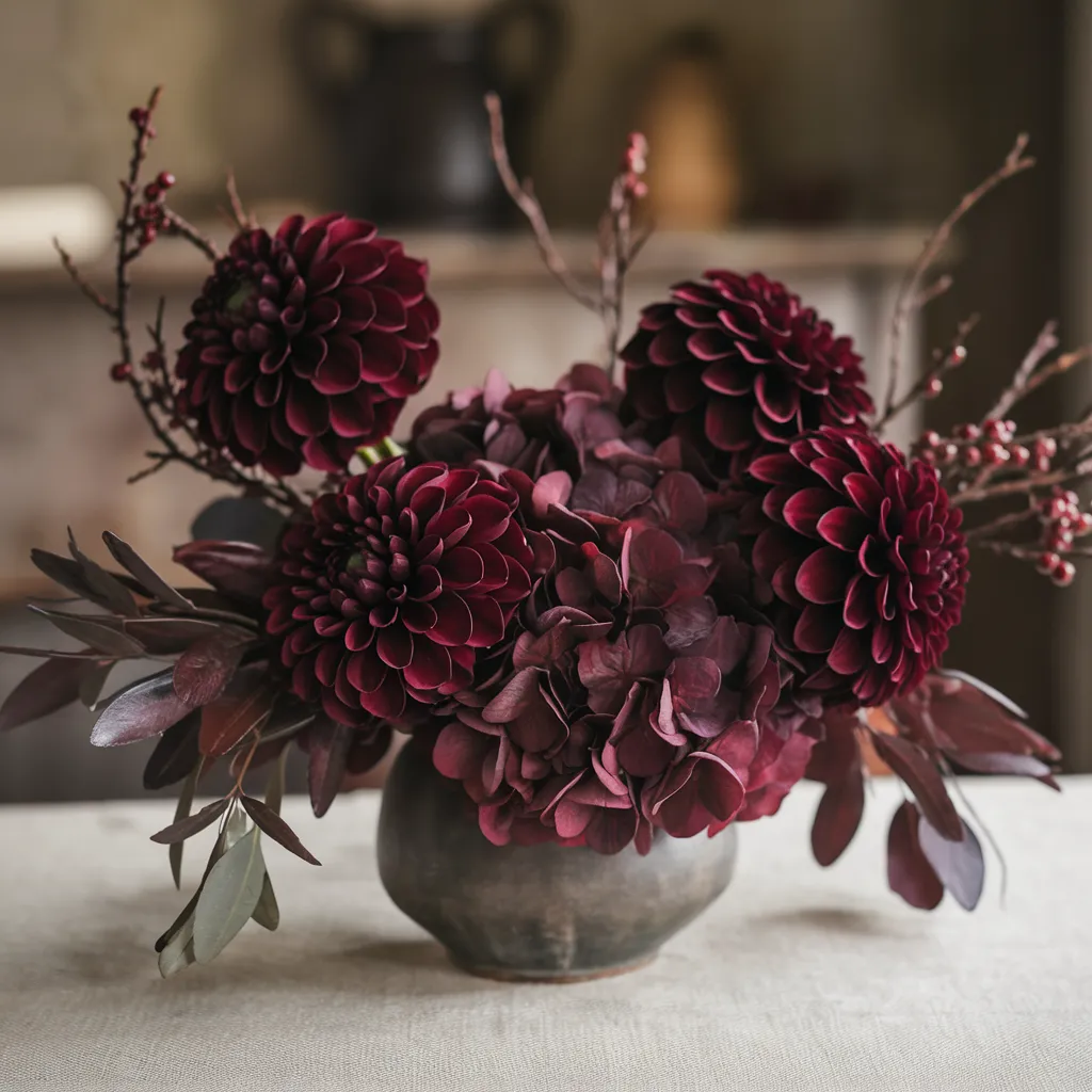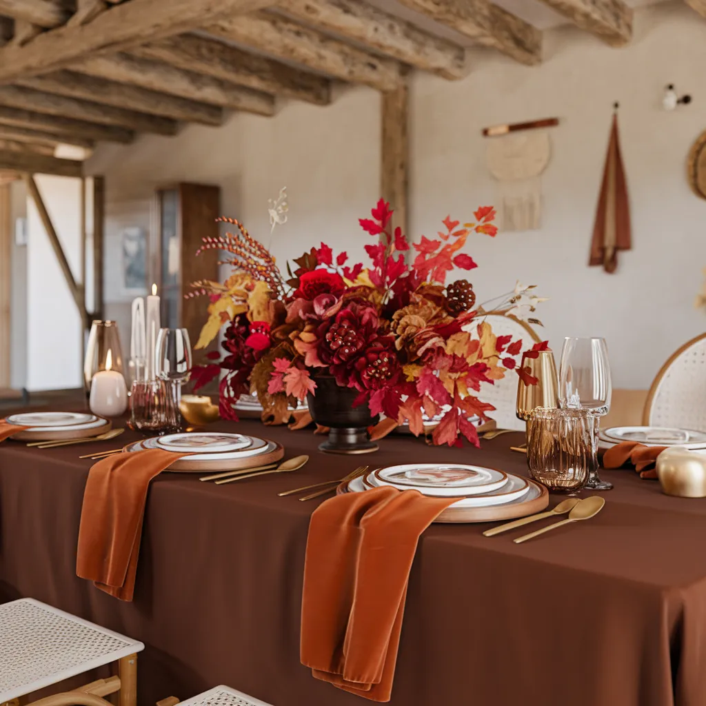 Autumn is a time of abundance, and what better way to celebrate than by incorporating nature’s gifts into your table decor? Consider incorporating seasonal flowers like deep burgundy dahlias or dusky red hydrangeas into your centerpiece or place settings. These rich, moody blooms contrast beautifully with neutral table linens and create a romantic, wild aesthetic. For added texture and interest, incorporate leafy or berry-laden branches into vases among the flowers. If fresh flowers aren’t an option, high-quality faux blooms can achieve a similar effect with less maintenance.