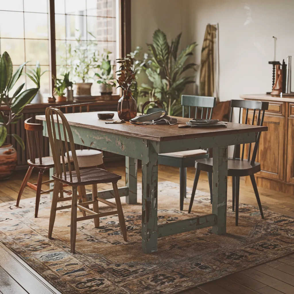 A rustic wooden dining table, bearing the charming imperfections of age, takes center stage surrounded by an eclectic mix of chairs in warm, earthy tones. Lush greenery and earthy ceramic accents evoke a connection to nature. The room embodies a modern farmhouse aesthetic with its raw materials, remixed vintage elements, and an overall worn, organic feel. The color palette blends muted grays, rich browns, and subtle green hues, creating a calming, grounded ambiance. Hints of terracotta and the patterned rug inject warmth and texture, while distressed finishes on the furniture lend a cherished, timeworn vibe.