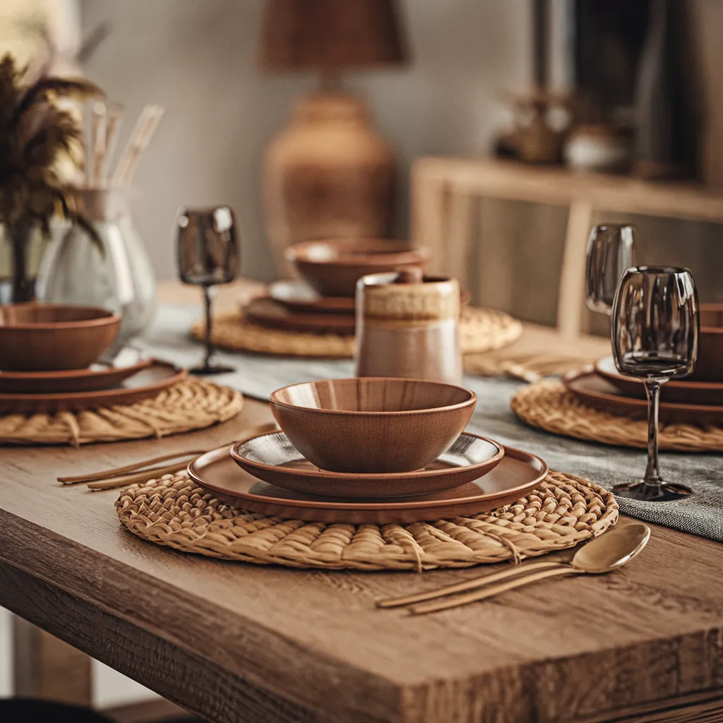A rustic wooden dining table is the centerpiece, adorned with earthy ceramic plates, bowls and woven placemats. Amber-hued goblets and brown ceramic vessels exude warmth against the natural wood surface. Complementing textures like braided place mats and sleek stoneware create an inviting modern farmhouse aesthetic. The muted color palette blends warm terracotta, creamy neutrals and raw timber tones for an organic, grounded feel. Quality materials like glazed ceramics, intricate woven textures and solid oak wood furnishings reflect a laidback yet refined rustic style.