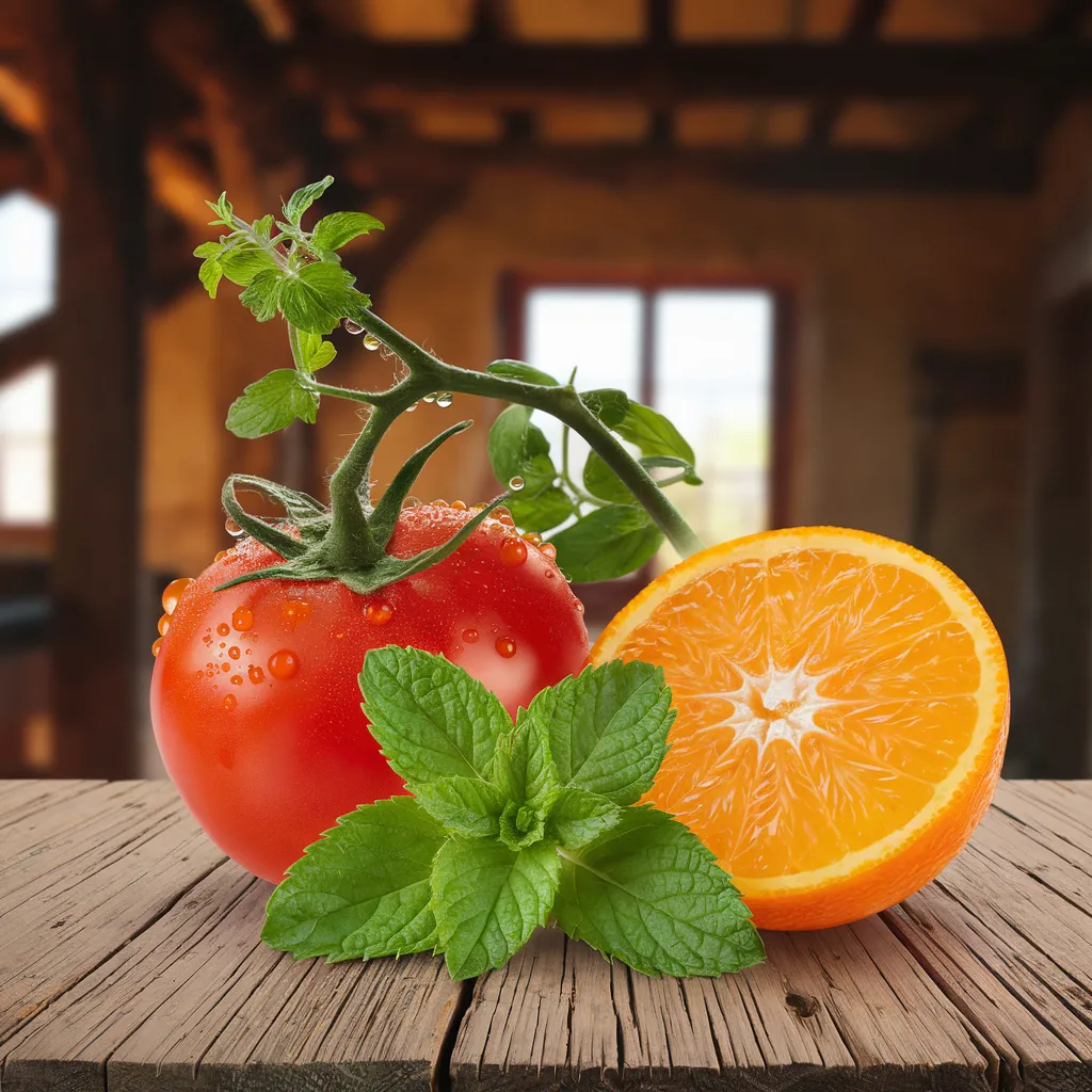 A ripe red tomato, dewy from the garden, sits alongside a plump orange, the two providing a vibrant still life against the rustic wooden surface beneath. Verdant mint leaves and a tomato plant’s tendrils complete the natural tableau, evoking an authentic botanical aroma. The warm terracotta tone of the tomato complements the juicy citrus orange, while shades of green from the herbs and vines provide crisp, earthy accents. This artfully composed image epitomizes the new sophistication in home fragrances – unexpected yet recognizable scents that capture the essence of nature itself, transcending artificial perfumes for a fresher, more intimate ambiance.