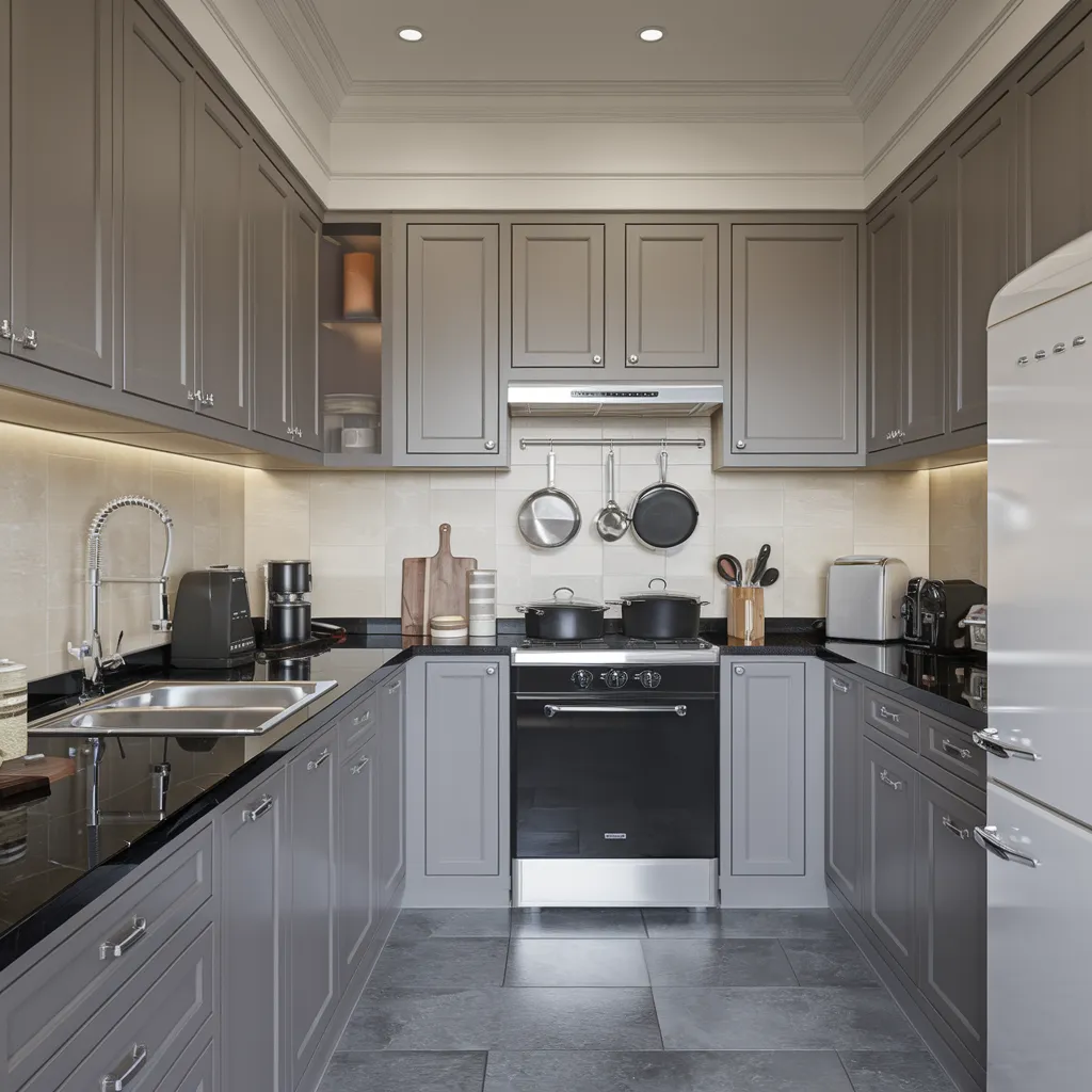 This kitchen presents raised‑panel gray cabinetry in a soft, muted mid‑tone—neither too cool nor stark. The countertops (and backsplash) are a warm, beige‑cream stone that adds contrast and tempers the gray’s coolness, allowing the cabinets to stand out while the stone brings visual warmth. The overall palette blends gray, cream, black, and warm neutrals, in a transitional style that balances elegance and comfort.