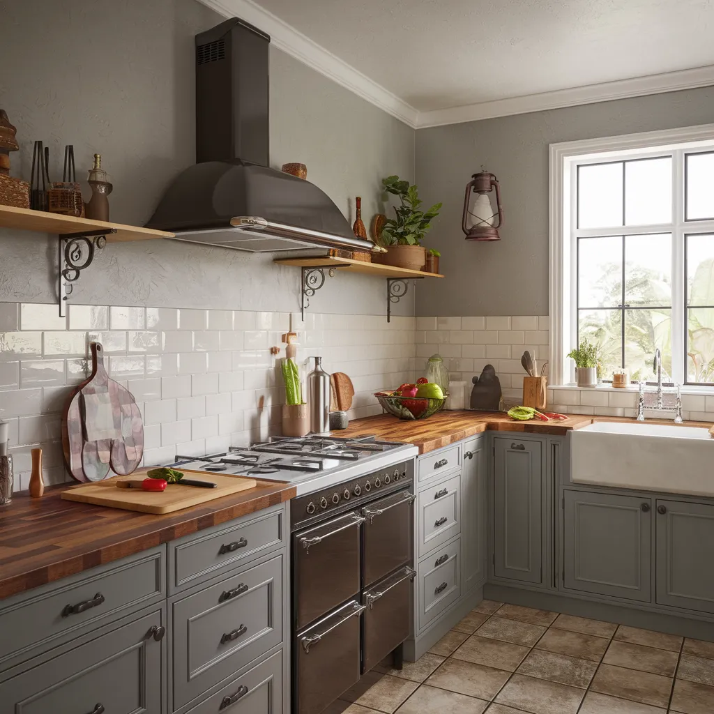 Sleek gray cabinets with contrasting warm wooden countertops create a striking yet harmonious design. Combining the modern aesthetic of cool gray with the natural texture and depth of wood surfaces, this kitchen showcases a contemporary style that balances minimalism and inviting warmth. The juxtaposition of materials and neutral color palette results in a visually compelling space that merges clean lines with organic elements for a sophisticated yet welcoming environment.