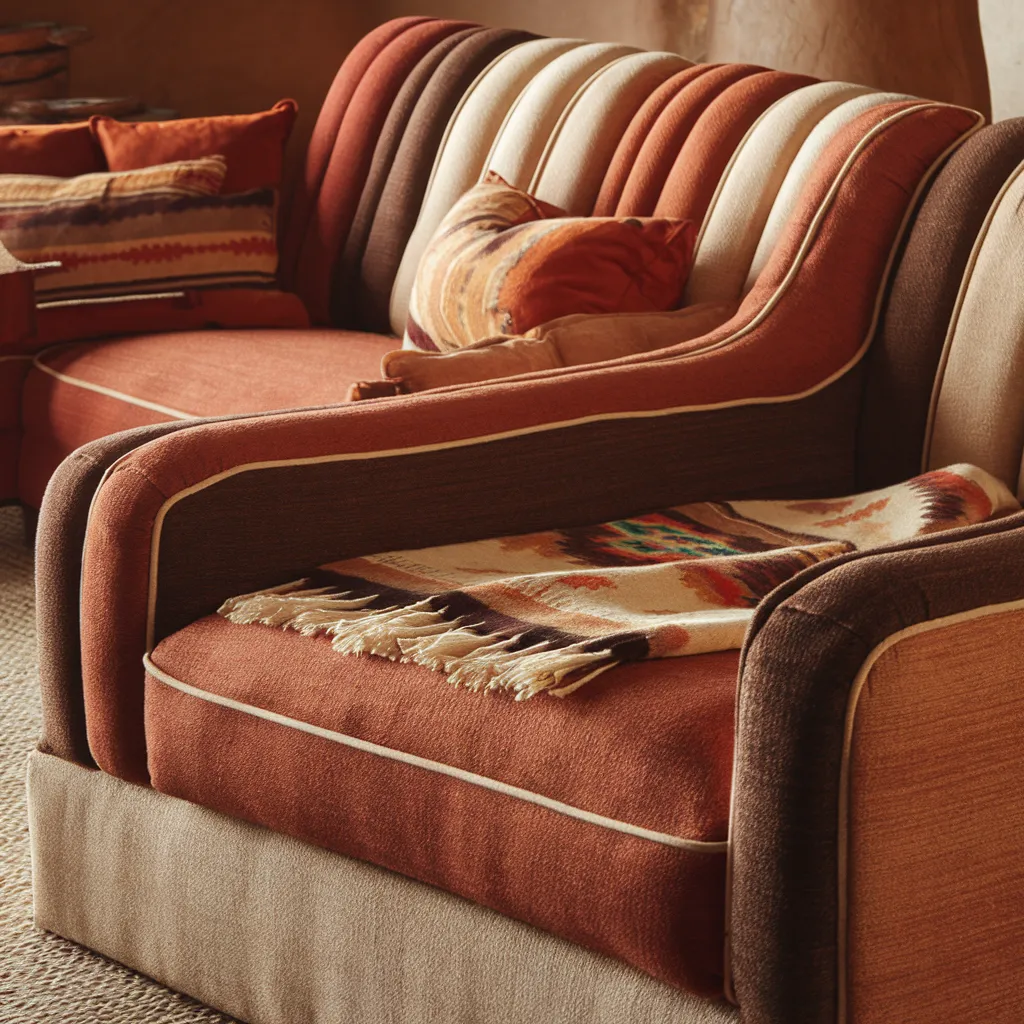 Plush chenille upholstery in earthy shades of terracotta, amber and chocolate brown envelops the cushions and armrests of this inviting sofa set. Contrasting piped details in creamy beige outline the curved contours, accentuating the plush textures and warm, organic tones. A woven throw blanket draped casually across the backrest introduces a rustic Southwestern flair with its geometric pattern in complementary desert hues. The wooden armrests reveal a hint of sleek, contemporary design amidst the cozy, rustic textiles. This eclectic fusion of natural fibers, warm earth tones and clean lines epitomizes a modern Southwestern interior style, offering a cozy yet sophisticated living space.