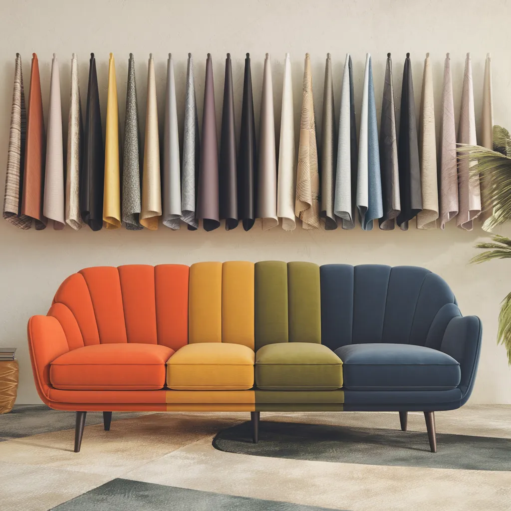 Rows of fabric swatches in varied colors neatly line the wall, showcasing a tasteful spectrum from warm terracotta to cool navy blues. Below, a curved sofa exemplifies contemporary design with its modular sections flowing seamlessly in complementary hues of orange, yellow, olive, and indigo. The furniture’s sleek upholstery appears to be crafted from durable yet inviting performance fabrics, likely engineered synthetics or microfiber blends designed to withstand the rigors of daily family living. The color palette transitions effortlessly from vibrant to muted tones, echoing the tactile textile samples overhead. Overall, the vignette embodies a fresh, modern aesthetic achieved through clever material choices and an avant-garde approach to color-blocking.