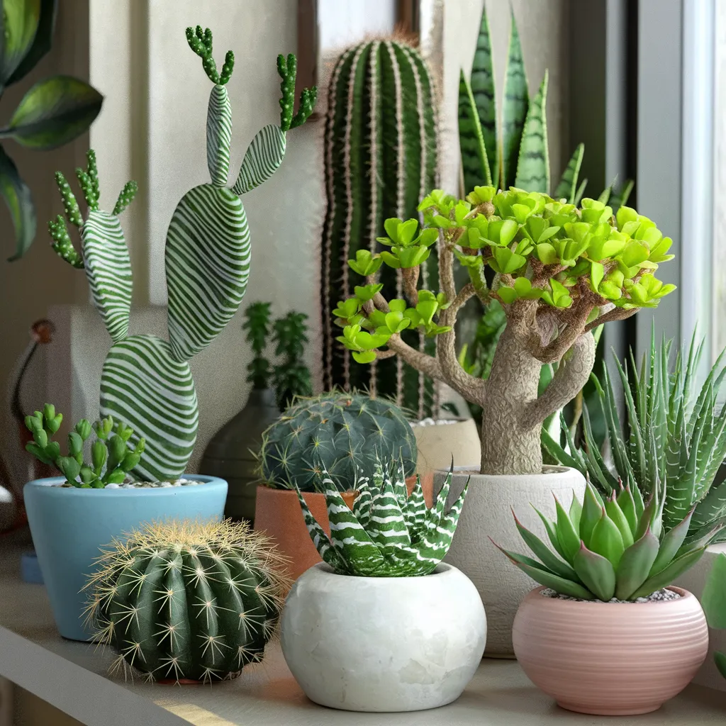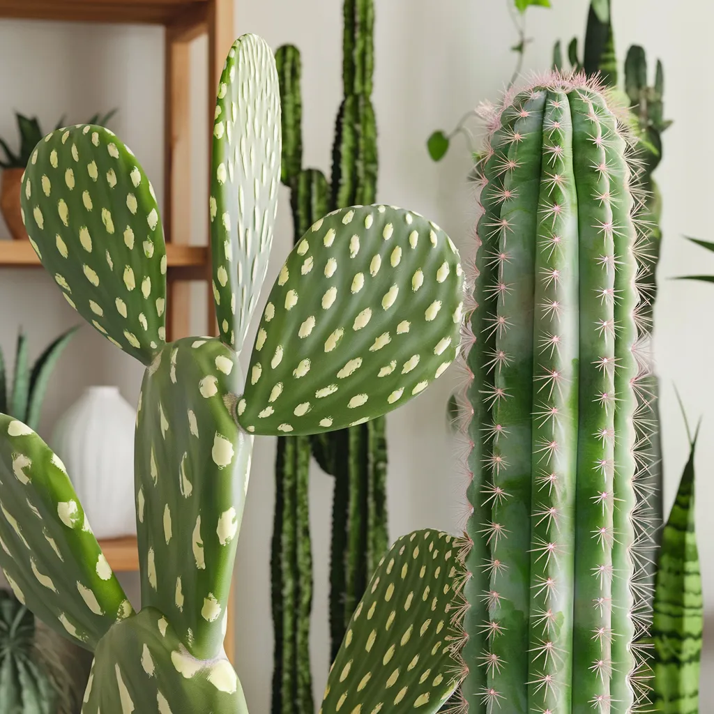 A striking array of potted cacti and succulents adorns a sun-drenched indoor space, embodying a vibrant, organic aesthetic. Spiky green forms of varying sizes mingle with smooth sculptural pieces, creating a visually captivating composition. The bohemian-inspired decor showcases natural materials like ceramic, woven textures, and raw wood elements in a soothing palette of earthy terracotta, soft whites, and lush botanical greens. Spines, ridges, and delicate tendrils add intricate textural interest, celebrating the resilient beauty of these low-maintenance plants. This indoor desert oasis exudes an inviting sense of serenity and wonder, providing a charming backdrop for nurturing a gardening passion year-round.