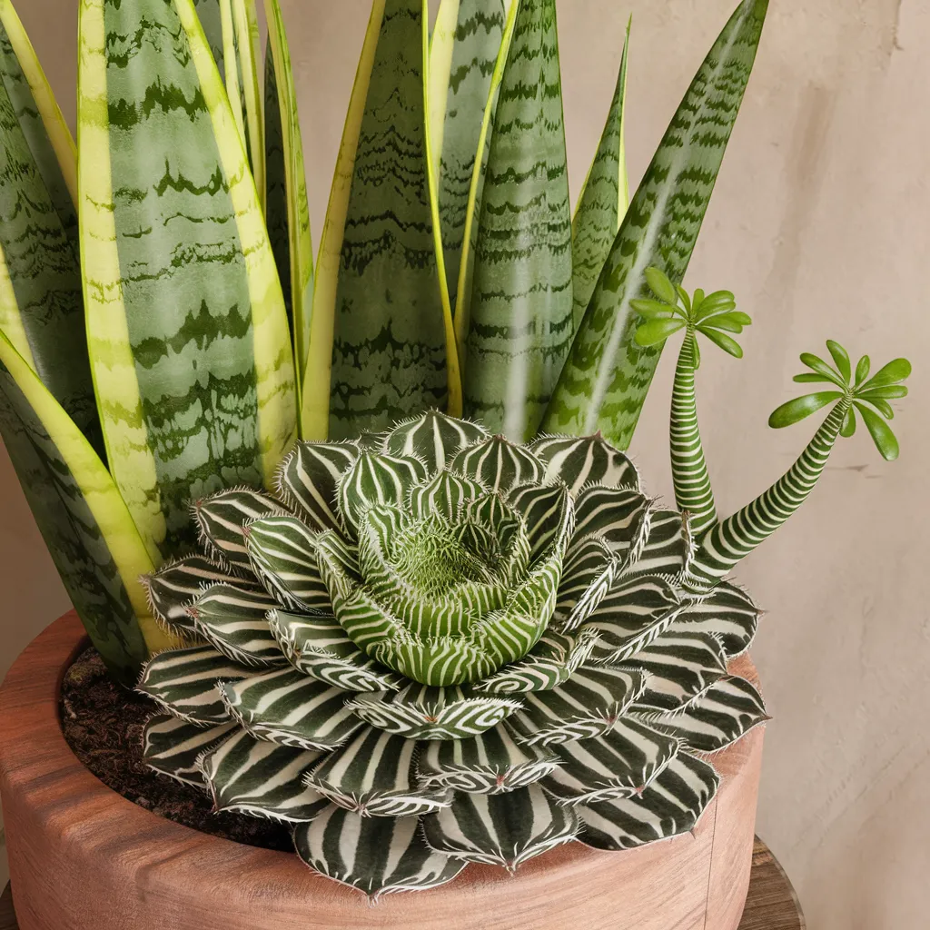 Verdant stripes adorn the mesmerizing rosette patterns of a zebra haworthia succulent nestled near tall, variegated snake plant leaves. The intricate haworthia presents newly formed offshoot rosettes amidst its sleek, fleshy fronds marked by creamy white banding against rich olive greens. The graceful snake plant exhibits revived jade-toned growth sprouting from its cylindrical, striped stalks – a study in resilience. These low-maintenance botanical specimens originating from subtropical regions showcase nature’s intricate, sculptural beauty through their distinctive foliage textures and eye-catching geometric forms. Their hardiness and ability to propagate new growth highlights their suitability for indoor cultivation bringing a refreshing, organic element to interior spaces.