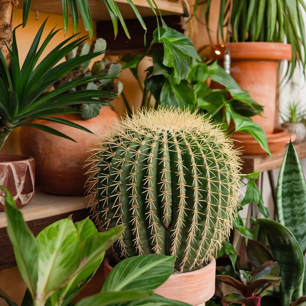 A pair of hands tenderly cradle a prickly cactus, its rounded green body densely covered in sharp spines. Surrounded by lush foliage from various tropical plants, the cactus stands out with its distinct shape and texture. The scene exudes a bohemian, nature-inspired aesthetic with terracotta pots, wooden shelves, and an array of verdant hues. Warm earth tones mingle with vibrant greens, creating a cozy, inviting ambiance reminiscent of a well-tended indoor oasis. The image beautifully captures the nurturing bond between plant and caretaker, celebrating the rewarding journey of cultivating an indoor garden sanctuary.