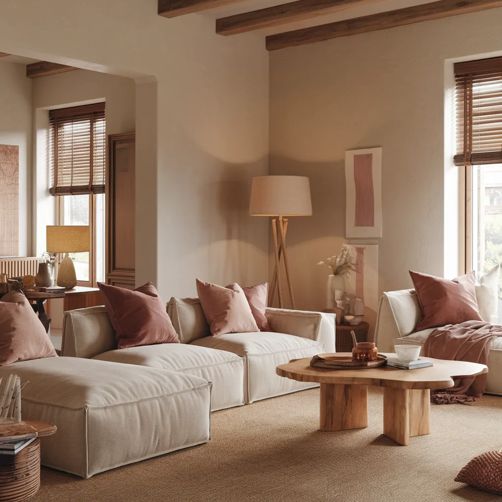 Warm earth tones and natural textures create an inviting living space with rustic appeal. A plush tan sofa with casual linen upholstery anchors the room, complemented by terracotta-colored ceramic accent tables and a textured jute area rug. Oak wood elements, including the exposed ceiling beams and coffee table, introduce organic lines and contrast against the crisp white walls. Dried botanicals and woven baskets heighten the earthy, bohemian aesthetic that celebrates natural materials and artisanal craftsmanship.