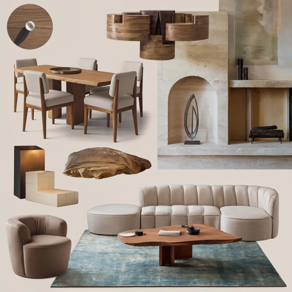 Contemporary collage of a dining area with minimal furnishings and an earthy, nature-inspired palette. Light wood floors, woven chairs, and streamlined oak table seamlessly blend rustic and modern elements. Creamy white walls allow rich terracotta, sage green, and sandy beige accents to pop while maintaining a serene, inviting vibe. Natural textures like jute rugs, clay pottery, and woven textiles add organic warmth.