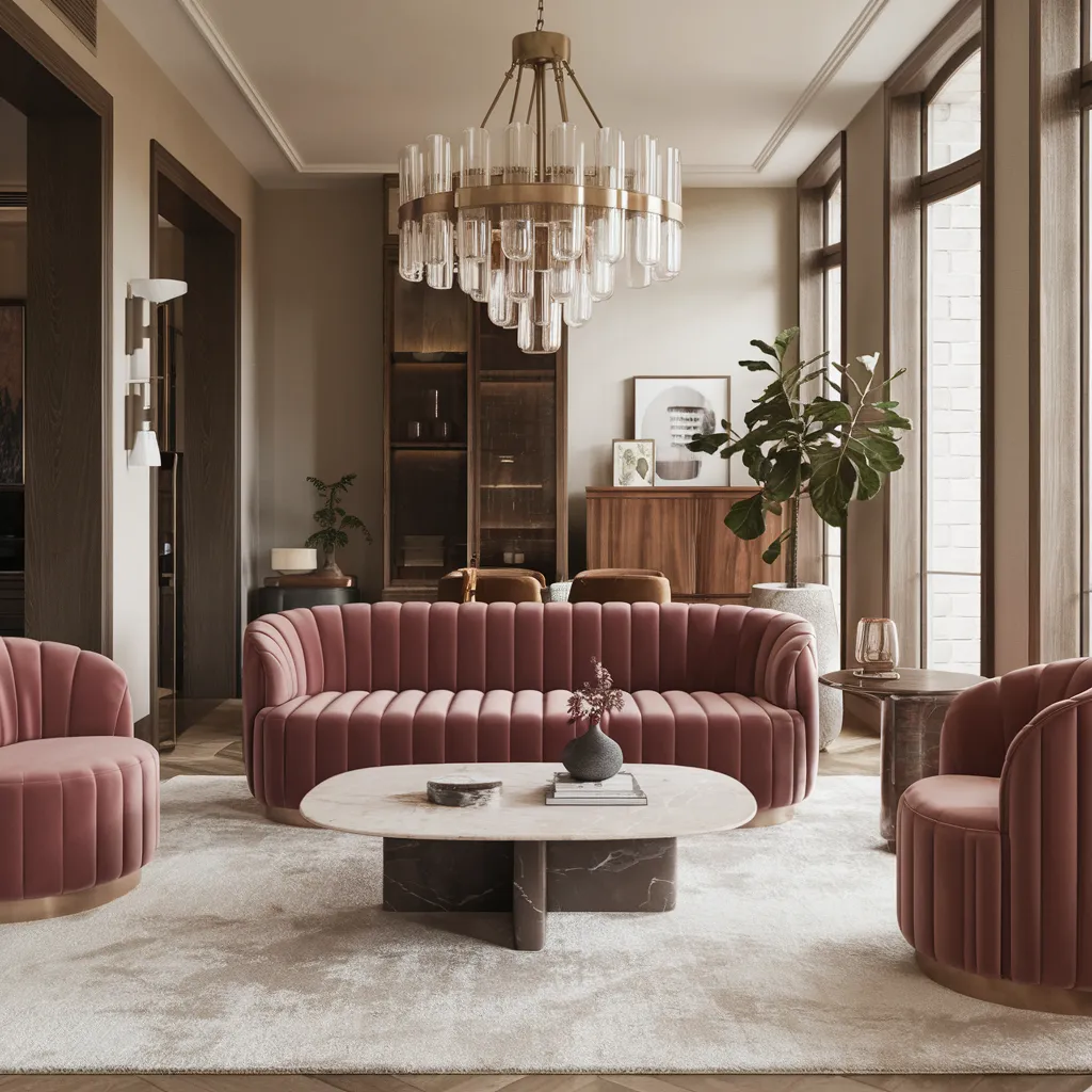 Elegant neutral living room with plush sofa, wood accents, and soft textural elements. Scandinavian minimalist style featuring oak furniture, linen upholstery, and ceramic decor in a palette of warm beiges, cool grays, and black accents. Contrasting textures of smooth wood, nubby linen, and sleek metal create visual depth and interest.