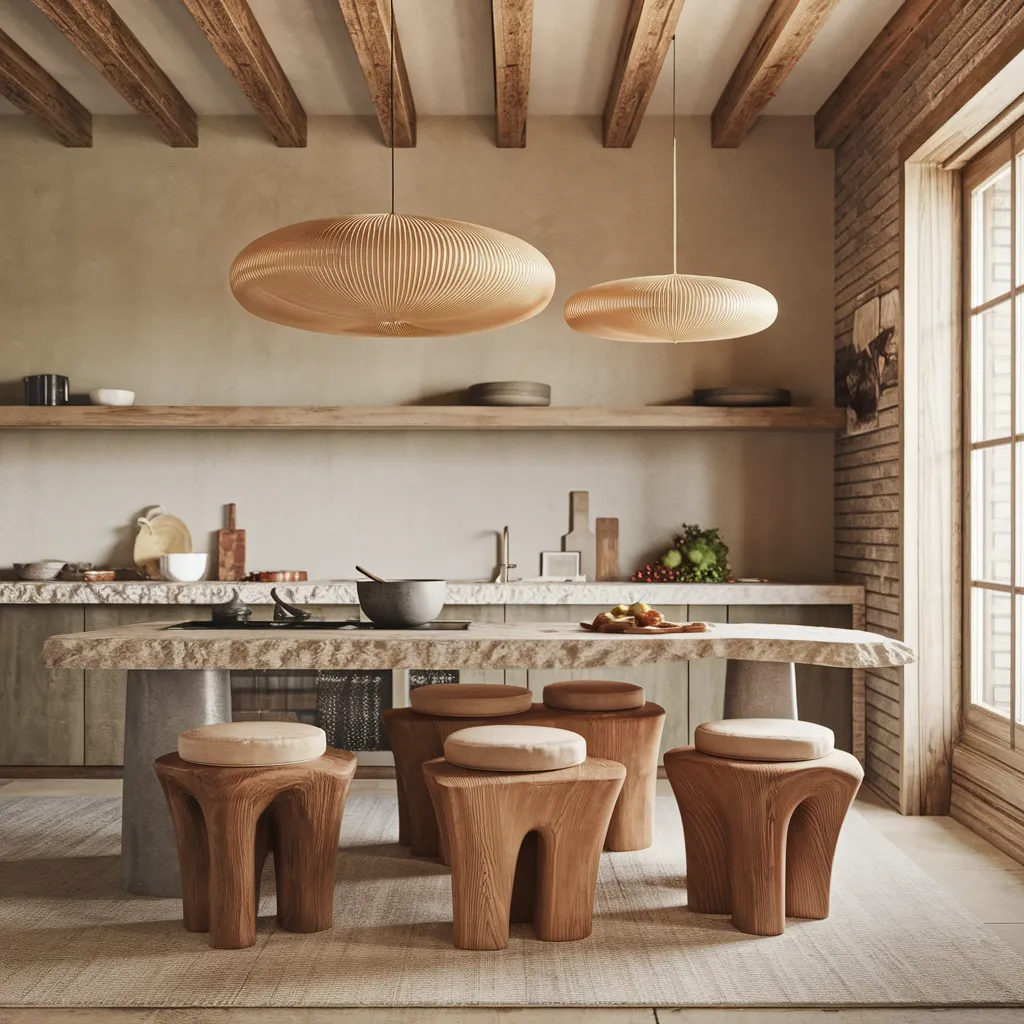 While these organic stools are undoubtedly eye-catching on their own, their true magic lies in how they’re styled within the kitchen. Designers recommend pairing them with marble or stone countertops for a refined contrast, or sticking to a cohesive color palette of neutrals, charcoals, or earthy tones for a harmonious look. Complementing the stools with organic accessories like statement lighting or linen seat pads can further enhance their natural appeal. And for those seeking subtle variety, mixing different wood tones throughout the kitchen can create a lived-in, layered elegance.
