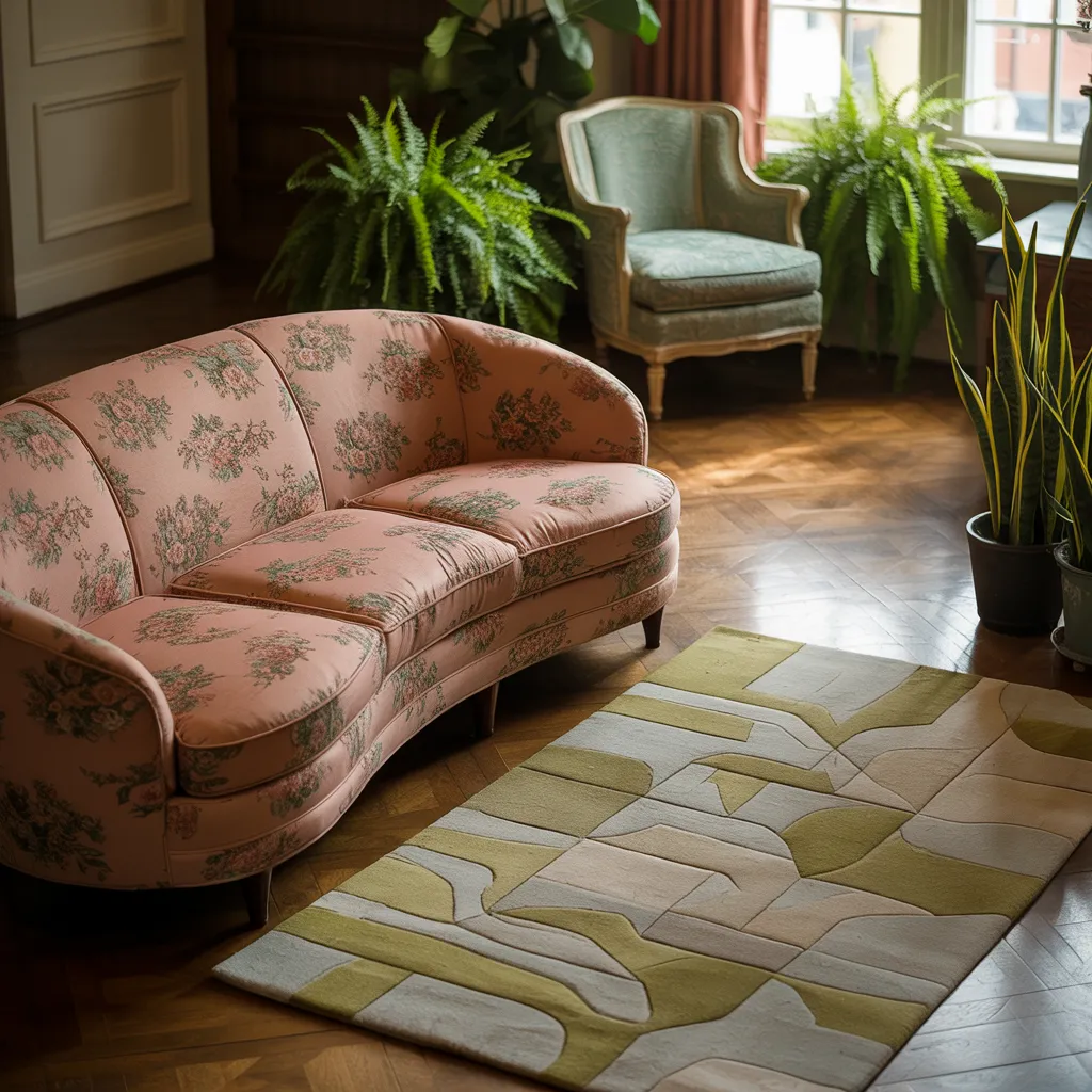 A curved pastel pink sofa adorned with delicate floral patterns takes center stage, accompanied by a sage green armchair and lush, towering ferns. The image exudes a warm, vintage-inspired aesthetic, enhanced by the rich hardwood flooring and intricate patterned rug in earthy olive and cream hues. The dominant color palette celebrates soft, muted tones reminiscent of mid-century design, with the plush upholstery fabrics and wooden furniture pieces embodying a timeless, romantic charm. Thoughtfully curated decor elements like the glazed ceramic planter add subtle textural contrasts, creating an inviting, nostalgic ambiance that seamlessly blends past and present.