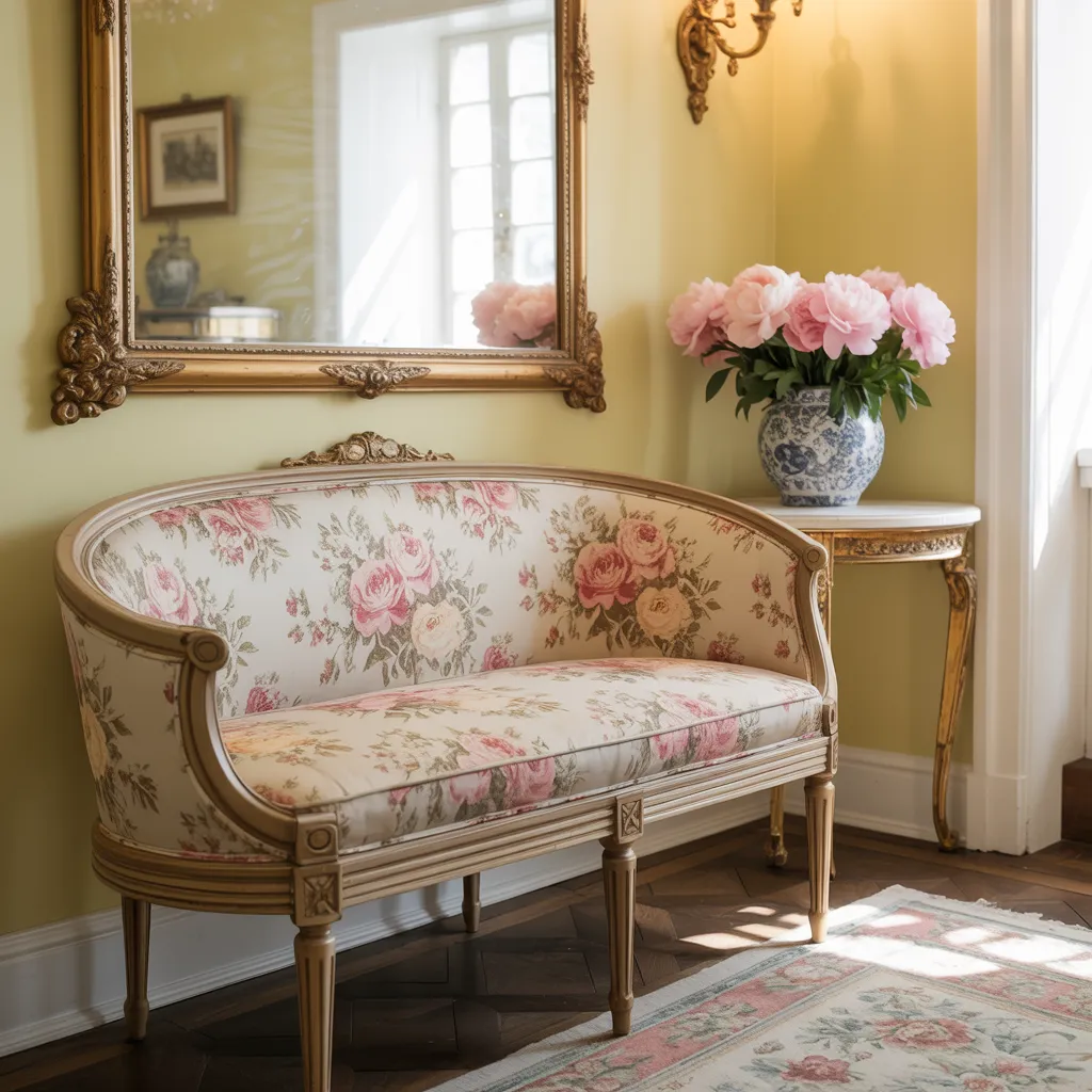 An ornately curved sofa with an intricate floral upholstery pattern takes center stage, exuding vintage glamour with its soft pink, cream, and muted green hues. A gilded wood frame and cabriole legs lend an air of timeless elegance. Nearby, a delicate porcelain vase overflows with lush pink peonies, complementing the romantic aesthetic. An intricately framed mirror reflects warm sunlight streaming through French doors, bathing the room in a warm glow. The dominant color palette celebrates pastel shades, from dusty rose to antique whites and sage greens, creating a nostalgic, feminine ambiance reminiscent of 1950s interior trends. This inviting sitting area epitomizes classic French country style, seamlessly blending floral patterns, ceramics, and gilded accents into an enchanting, romantic retreat.