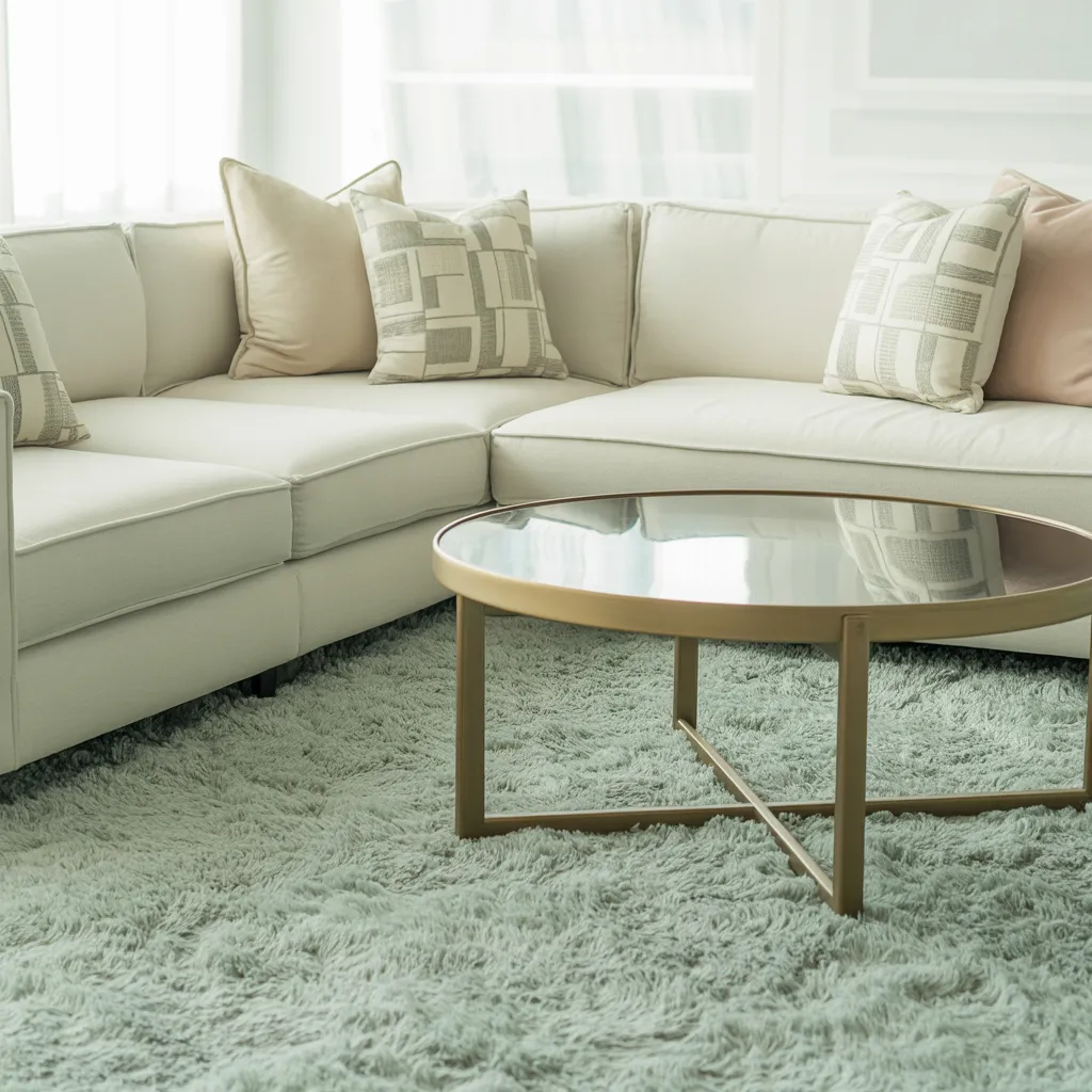 A curved, contemporary sectional sofa harmonizes with plush cushions in soft neutral hues – pale grays, subtle tans, and creamy whites. The understated color palette exemplifies modern minimalism with pastel tones that avoid feeling overly sweet. Natural materials like pale oak wood for the sleek oval coffee table and textured area rug introduce warmth. Patterned accent pillows in geometric prints add depth without overwhelming the serene aesthetic. This living space embodies refined elegance through clean lines, thoughtful layering of textures, and a muted yet sophisticated mix of gentle, pastel-inspired neutrals that feel timelessly chic.