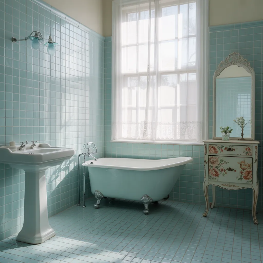 A serene, airy bathroom with tiled walls in a soft aqua hue. A freestanding vintage bathtub takes center stage, its crisp white curves complemented by an ornately framed mirror. Natural light streams through sheer curtains, creating a calming ambiance. The pedestal sink and ornate commode echo the whitewashed palette, while a distressed floral vanity adds a romantic, feminine touch with its delicate floral motif. White subway tiles, polished chrome fixtures, and the marble window trim introduce sleek contemporary accents, blending seamlessly with the room’s vintage-inspired charm. A decidedly soft, pastel color scheme evokes a tranquil, rejuvenating retreat.