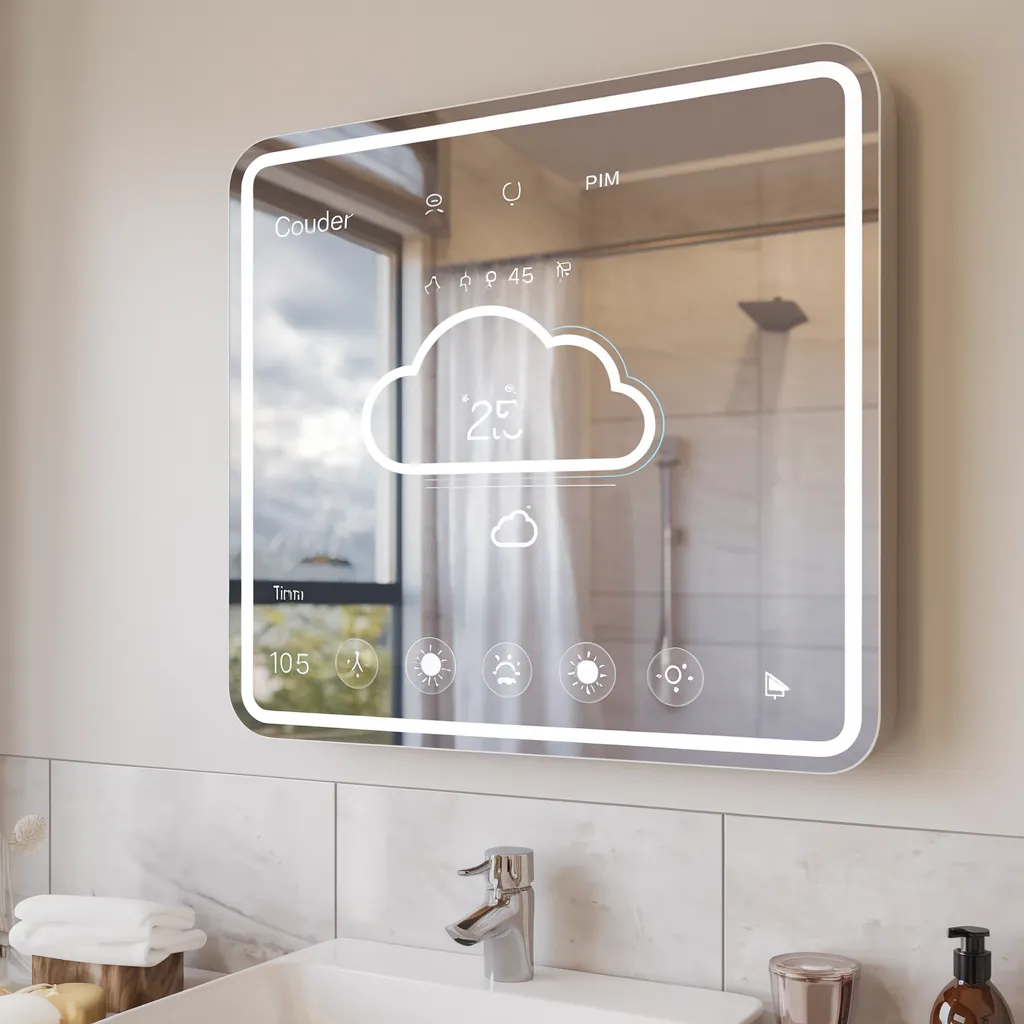 A sleek and modern bathroom mirror that seamlessly integrates technology into its design. The frameless mirror features a Bluetooth speaker, digital display for weather, time, and temperature, and voice activation capabilities for controlling smart home devices or accessing music and news via smartphone connectivity. With its clean lines and minimalist aesthetic, this smart mirror exemplifies contemporary luxury and convenience. The mirror’s surface exudes sophistication through its reflective glass and integrated LED lighting, complemented by a matte black trim for a touch of understated elegance. This cutting-edge bathroom accessory blends functionality with minimalist design for a truly elevated experience.