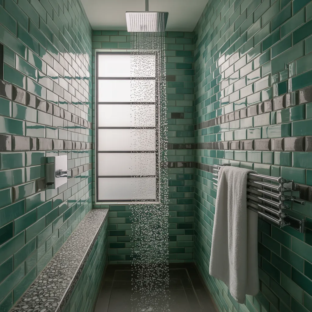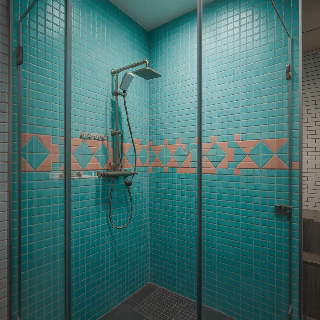 A sleek, modern shower enclosure dominates the space, showcasing a vibrant turquoise tile design. Floor-to-ceiling teal subway tiles create a seamless, enveloping backdrop, punctuated by geometric border accents in contrasting terracotta. The contemporary aesthetic is reinforced by clean lines, a minimalist shower fixture in brushed metal, and the lack of embellishments, allowing the bold color palette to take center stage. The overall style leans towards urban industrial chic, elevated by the strategic use of warm earthy accents that soften the cool aquatic tones. A harmonious blend of form and function, this invigorating shower evokes a spa-like sanctuary.