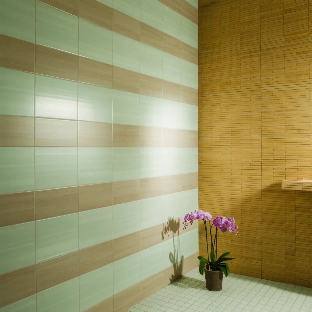 Horizontal stripes of muted green, tan, and white elongate the tiled wall, creating a soothing ombre effect. An adjacent wall showcases warm, textured bamboo-style tiles in a rich honey tone. A simple plant holder with vibrant purple orchids introduces an organic touch. The overall design exudes a tranquil, spa-like ambiance with its neutral palette and natural materials like ceramic tiles and woven textures. The clean lines and minimalist aesthetic suggest a contemporary or Zen-inspired decor style, perfectly complementing the serene, rejuvenating atmosphere of a luxury shower space.