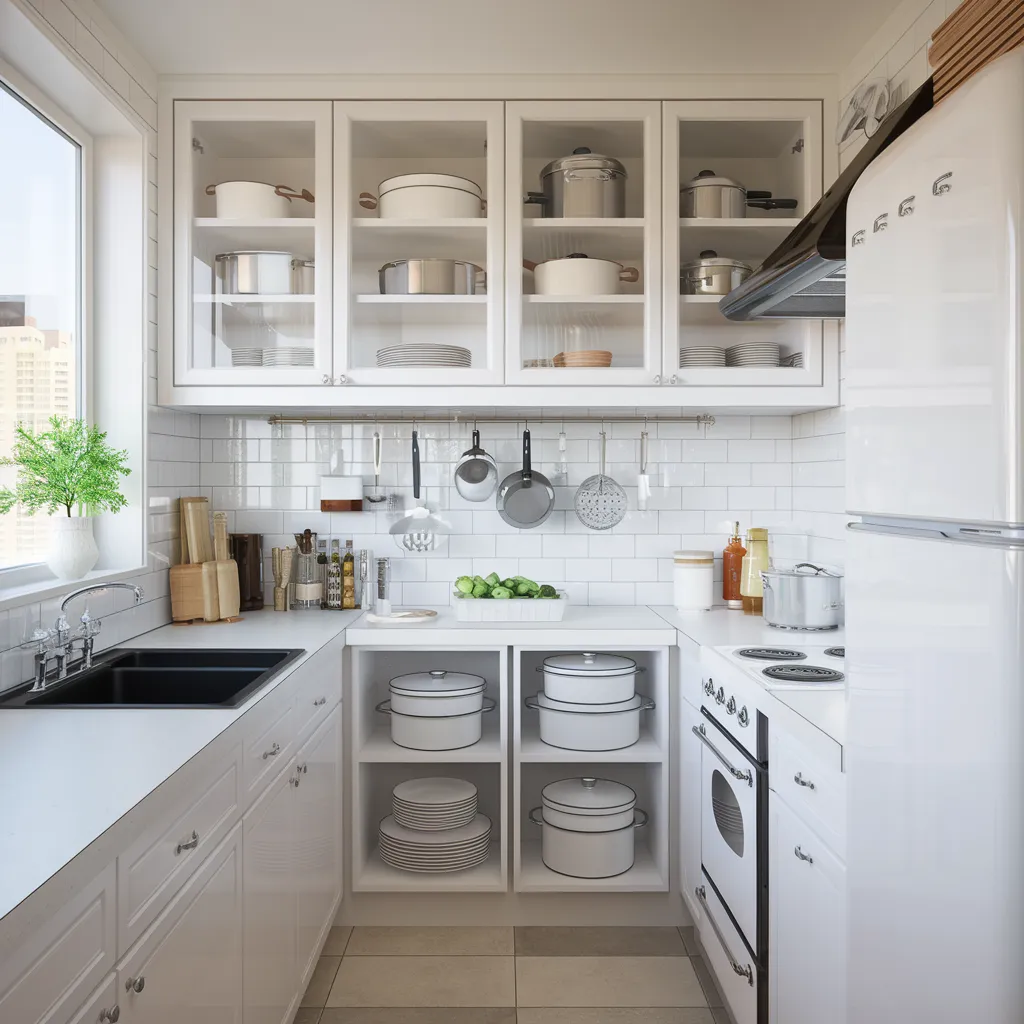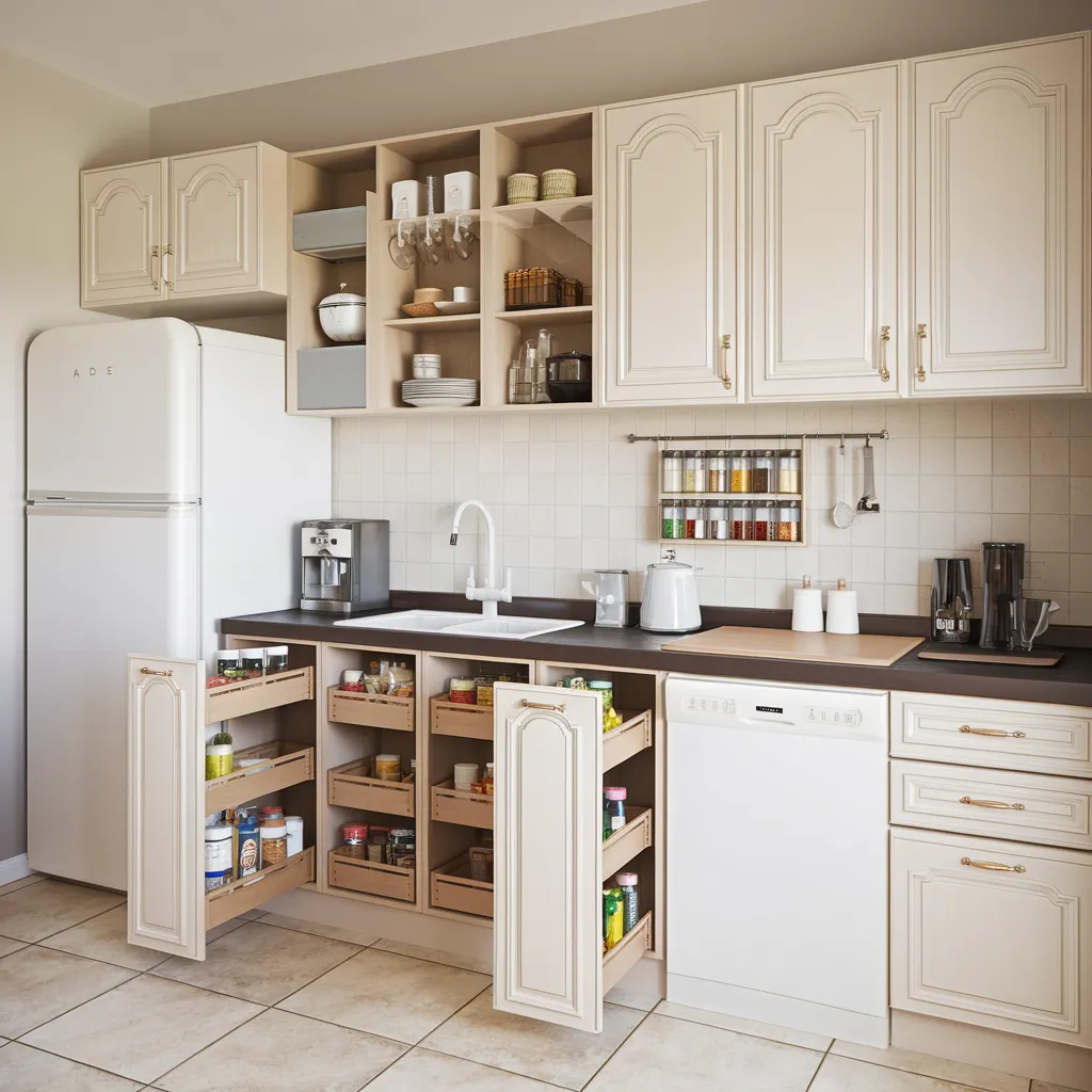 A bright kitchen maximizes storage with shallow cabinets featuring pull-out shelves, keeping essentials organized and within reach. Classic cream cabinetry paired with a sleek dark countertop balances tradition with functionality, while open shelving and spice racks add a practical touch. The design embodies understated elegance, with a color scheme of warm whites, beige, and muted wood that maintains a light, open feel perfect for compact layouts.