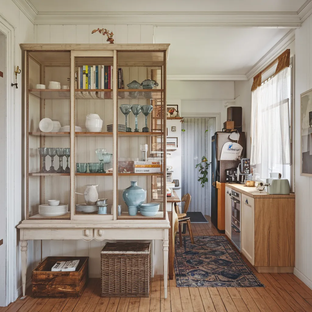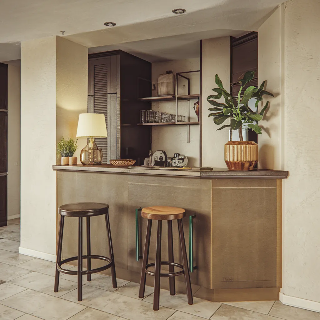 This compact bar nook demonstrates how shallow cabinetry can double as both storage and a stylish focal point. Warm wood tones, open shelving, and minimal accessories create a modern rustic feel, while the layered textures—from a ribbed planter to a glass lamp—add depth without crowding the small footprint. The palette leans on earthy neutrals: taupe, brown, and soft cream, creating an inviting yet efficient use of limited space.