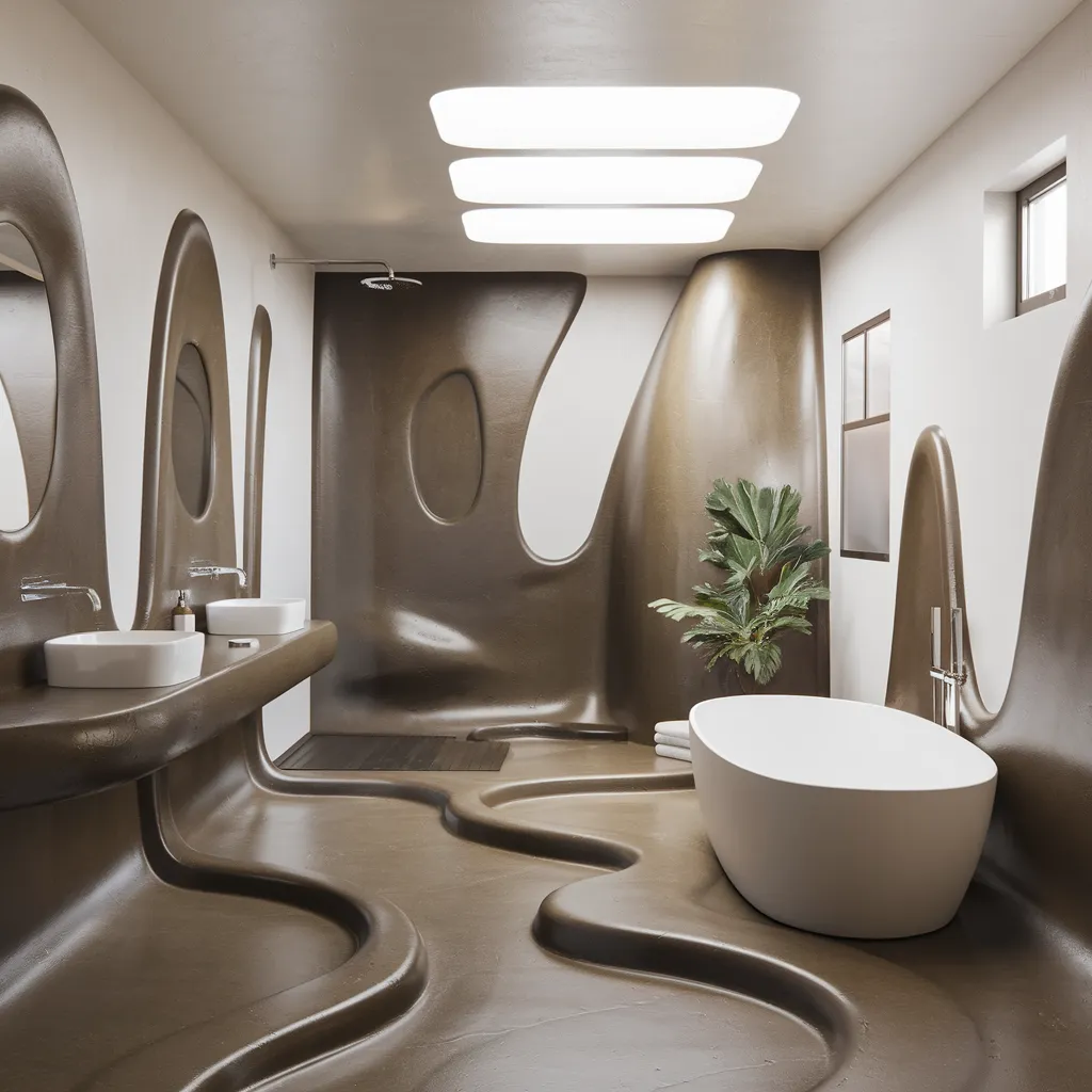 Seamless microcement coating for bathroom floors and walls creates organic, flowing forms. Durable yet eco-friendly surface sculpts fluid transitions between fixtures. Warm gray palette with sandy undertones offers tactile, contemporary design.