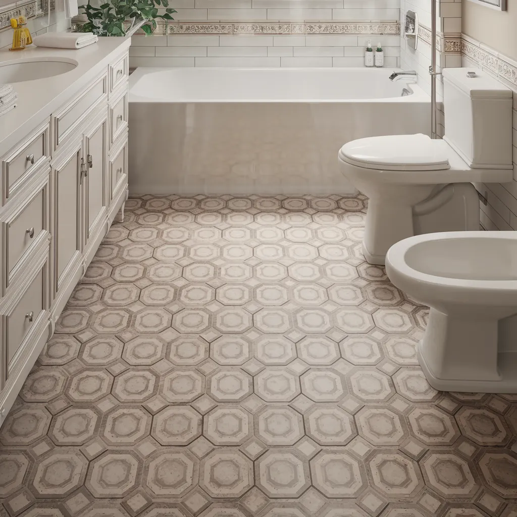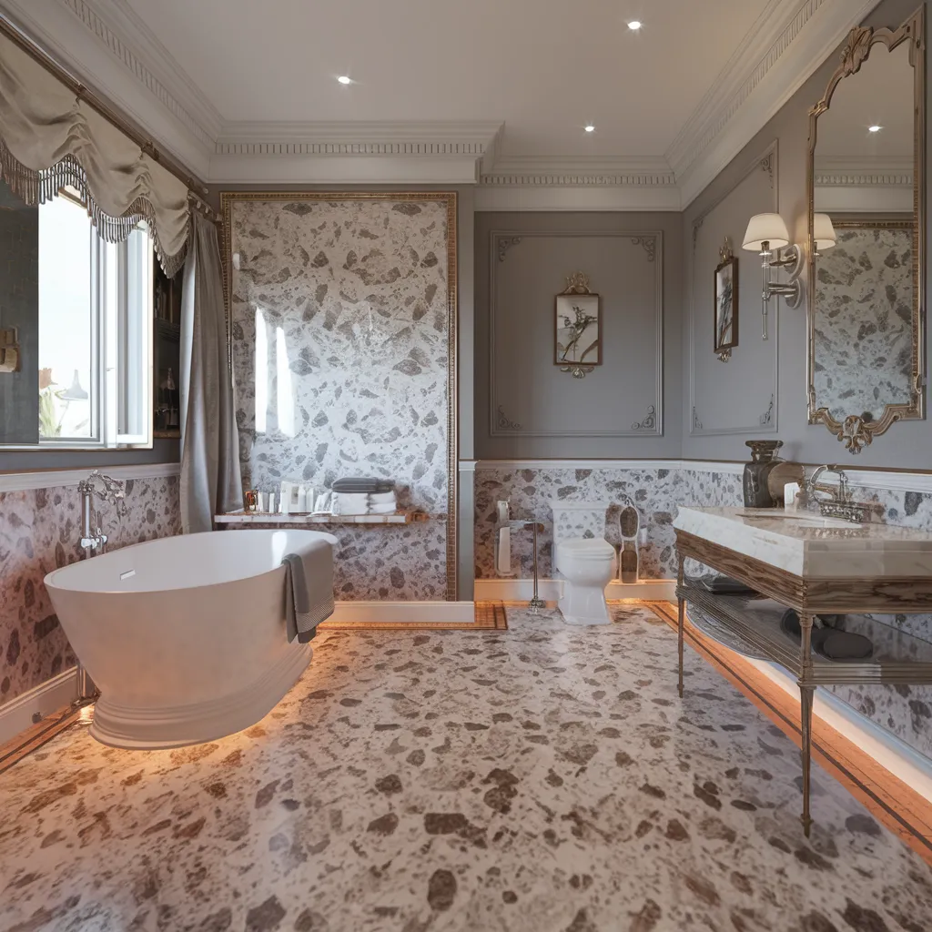 Terrazzo flooring offers a timeless elegance that transcends trends, while embracing the principles of sustainability. Crafted from marble and stone chips bound together with concrete, terrazzo reduces waste in the stone industry, transforming offcuts into enduring beauty. Its durability and water resistance make it an ideal choice for bathroom spaces, while its compatibility with underfloor heating adds an extra layer of luxury. Routine care involves using pH-neutral cleaners, ensuring the surface maintains its lustrous allure over time. With its rich history and contemporary appeal, terrazzo invites designers to create bathroom sanctuaries that celebrate both heritage and environmental responsibility.