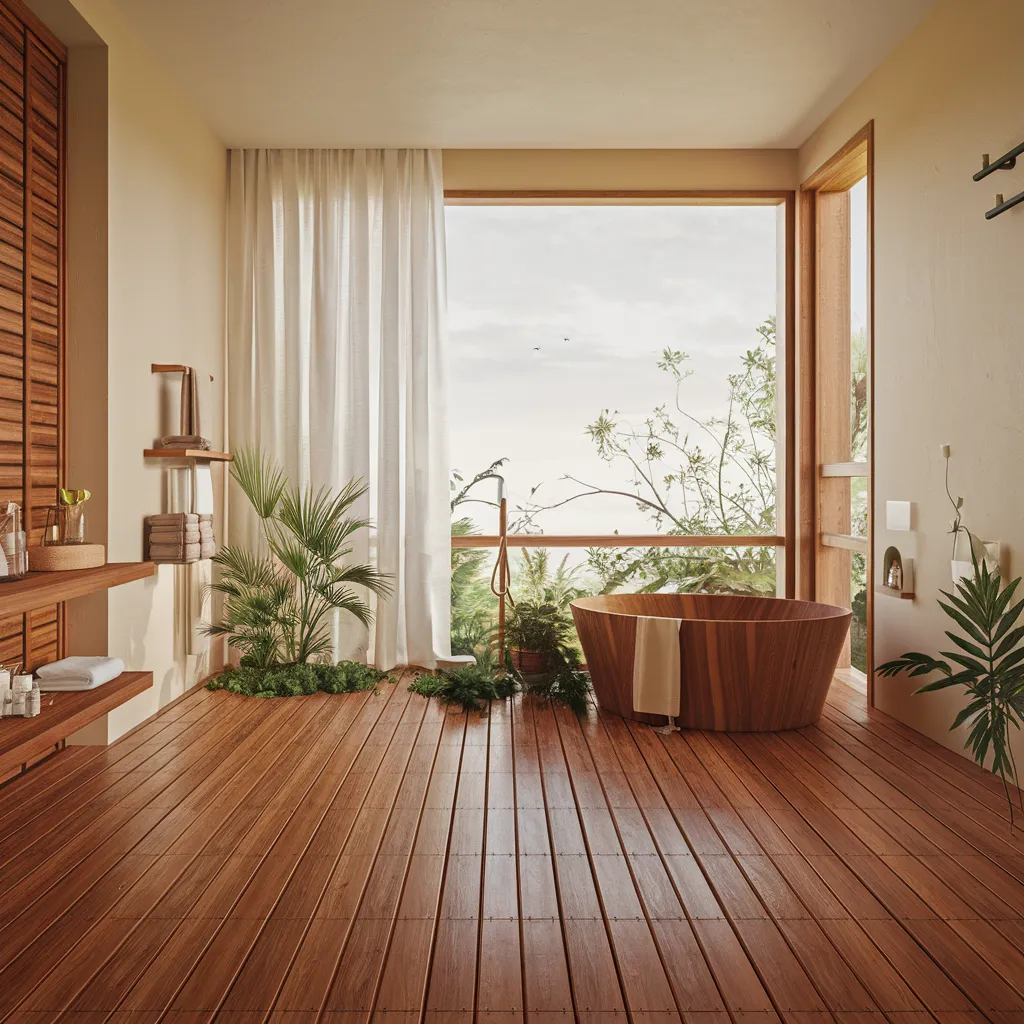 A serene, spa-inspired bathroom showcases bamboo flooring that radiates warmth and sustainability. The natural, golden hues and distinctive grain patterns lend an organic, zen-like ambiance. The use of this moisture-resistant, eco-friendly material reflects a harmonious fusion of nature and modern living. Complemented by neutral tones and natural textures, the warm bamboo floors create a calming sanctuary for relaxation.