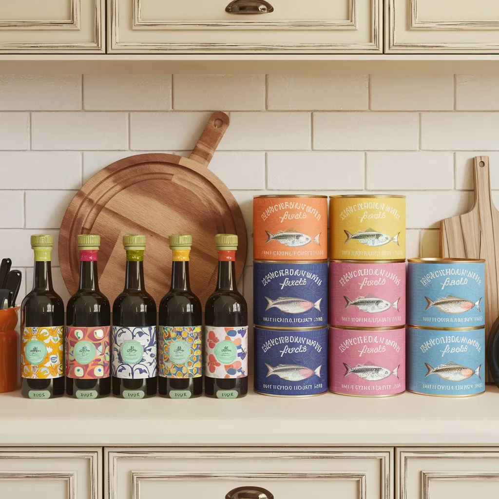 Pantry staples arranged with thoughtful curation and minimalist style. Wooden cutting board and neutral tones create an earthy, calming backdrop. Artfully labeled cans of various fish complement the simple sophistication. Rows of bottles display vibrant motifs with muted colors – oranges, blues, yellows. Clean lines from cabinetry and ceramic containers embody a serene, uncluttered modernity. Natural textures of wood, glass, and brushed metal radiate understated warmth. The harmonious arrangement celebrates visual mindfulness by elevating everyday culinary items into composed objets d’art.