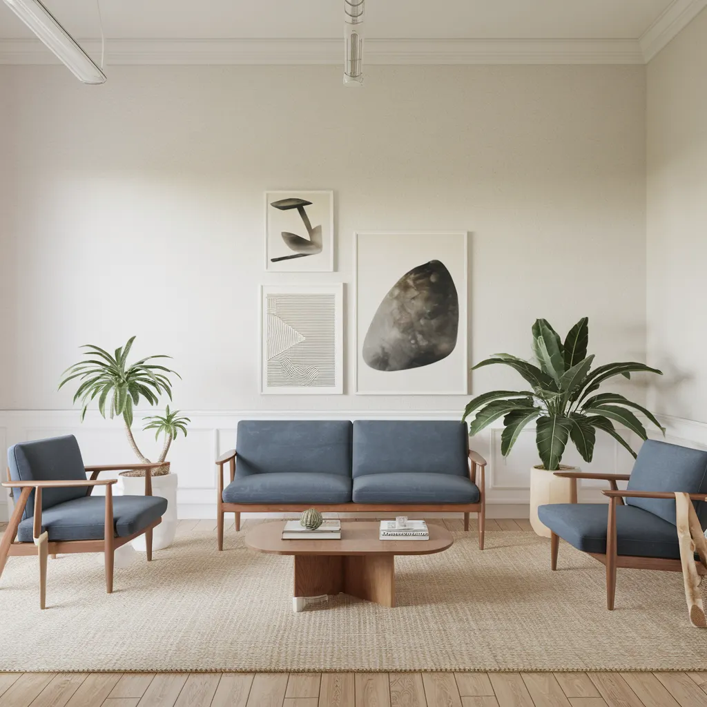A tranquil living space with Scandinavian-inspired minimalism. Mid-century modern oak furniture pieces, including a sofa, armchairs, and round coffee table, create a warm, inviting ambiance. Large earthenware planters hold lush green palms, adding natural textures. The color palette mixes cool grays and blues with muted neutrals for a serene, calming atmosphere. Abstract artwork in black-and-white tones provides striking visual interest. Soft linen upholstery and a natural fiber area rug incorporate tactile elements into the space’s streamlined aesthetic, exemplifying the visual decluttering concept of curating essentials with purpose.
