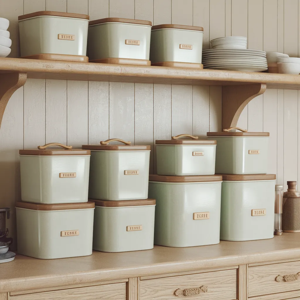 Rows of uniform ceramic canisters line the shelves, their soft sage hues and warm wood accents exuding a soothing, natural ambiance. The sleek cylindrical forms, adorned with simple text labels, create an atmosphere of tranquil minimalism. This understated display epitomizes the contemporary trend of visual decluttering, where streamlined organization meets a muted, earthy color palette. The seamless blend of pottery and light-toned wood showcases the beauty in simplicity, inviting a sense of calm and order into the kitchen space. The overall aesthetic captures the essence of modern rustic design, where clean lines and natural materials converge in harmonious unity.