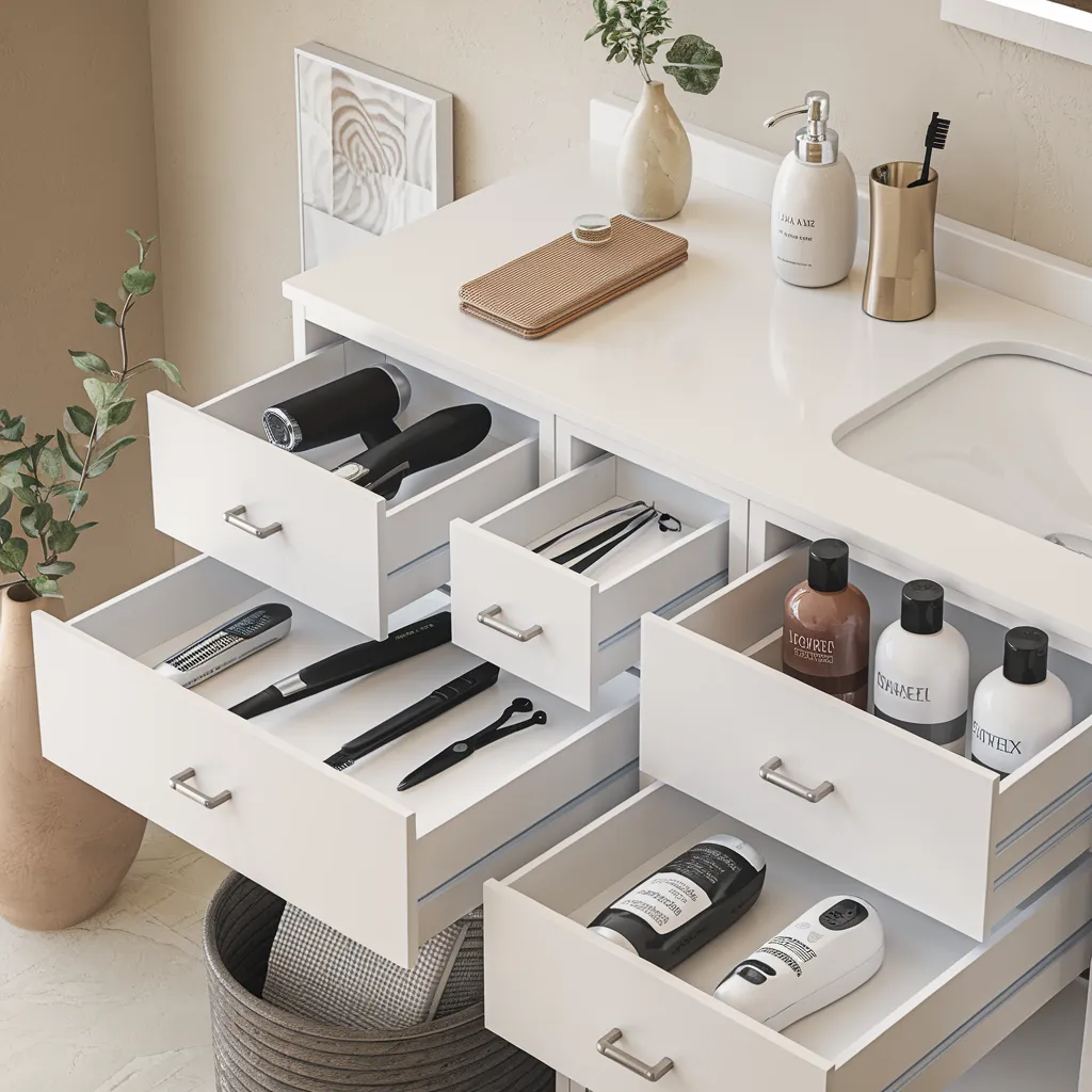 A minimalist vanity featuring pull-out drawers and open shelves showcasing an organized display of beauty essentials and accessories. The crisp white cabinetry exudes a clean, modern aesthetic complemented by warm tan accents in woven baskets and ceramic vases. Sleek metal hardware and clear glass bottles contribute to the streamlined visual harmony. The muted color palette of neutrals, from pale grays to rich terracotta tones, harmonizes seamlessly with black accents, creating a calming yet elevated ambiance. This storage solution exemplifies the visual decluttering trend, with neatly arranged products free from distracting packaging for a cohesive, brand-agnostic sanctuary.