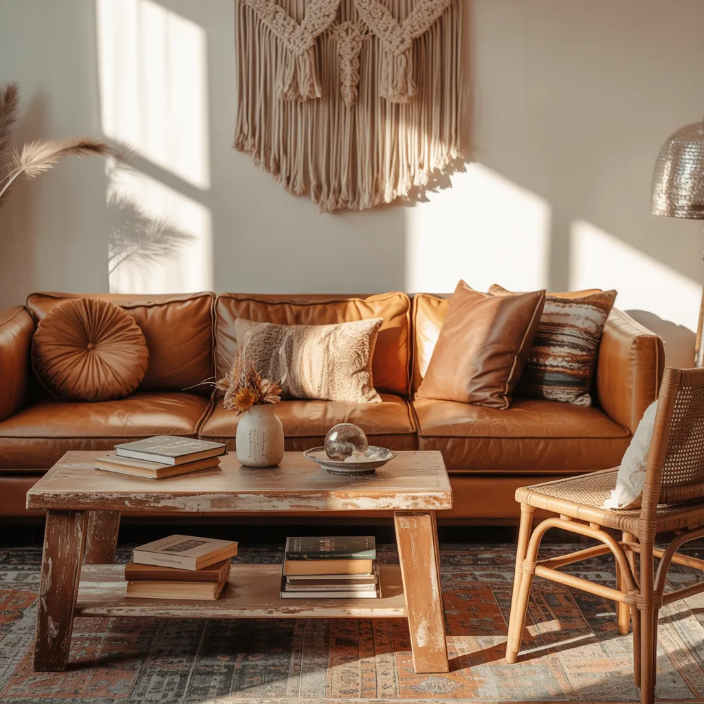 A sun-drenched living space with a luxuriously plush leather sofa as the centerpiece, adorned with a profusion of patterned throw pillows in warm terracotta, beige, and earth tones. An ornate macramé chandelier hovers overhead, complementing the bohemian aesthetic. Rustic elements, such as a weathered wood coffee table and cane armchair, create a laid-back and well-traveled vibe. Tactile textures abound, from the nubby woven area rug to the metallic ceramic accents, embodying the essence of bohemian décor through a harmonious blend of rich materials, global patterns, and an inviting, layered ambiance.
