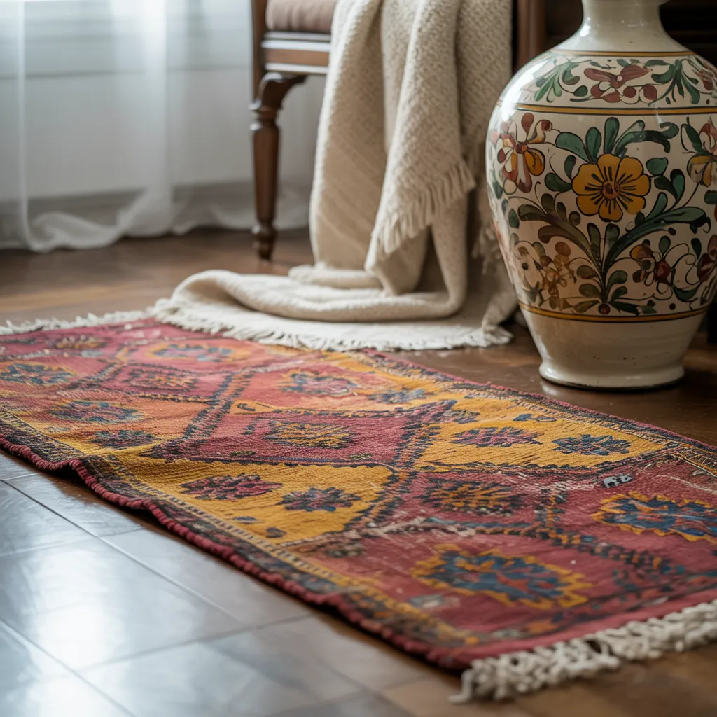 A vibrant vintage rug anchors the space, its rich colors blending terracotta, mustard yellow, and deep blues in an intricate geometric pattern. An ornately patterned ceramic vase stands beside a plush armchair draped in cozy cream throws. The room exudes a bohemian flair, telling stories through carefully curated textiles and decor. The materials range from the natural fibers of the wool rug to the glazed earthenware vase. Warm, inviting hues contrast with neutral linens, collectively creating a space that feels well-traveled and full of character – a true bohemian sanctuary.