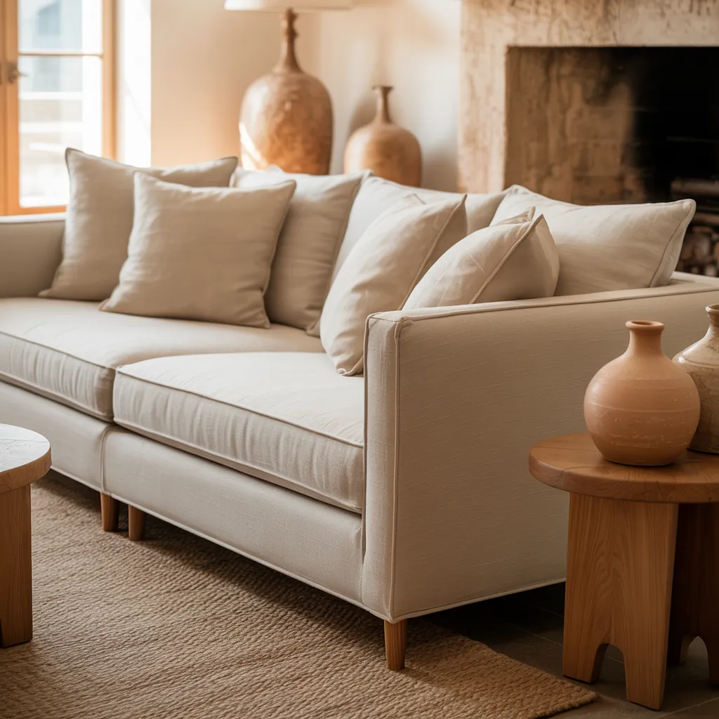 A cozy living room with a warm, earthy color palette exudes comfort and tranquility. The centerpiece is a plush beige sofa, complemented by beige linen cushions and neatly arranged wooden side tables. Crafted from solid oak wood, the tables display ceramic vases in earthy tones, bringing natural elements indoors. A woven jute area rug anchors the space, its neutral tones providing a grounding foundation. The minimalist decor, dominated by warm beiges, terracotta accents, and hints of greenery, embodies a modern bohemian aesthetic that feels inviting and serene. The overall design strikes a harmonious balance between simplicity and organic textures, creating a calming sanctuary.