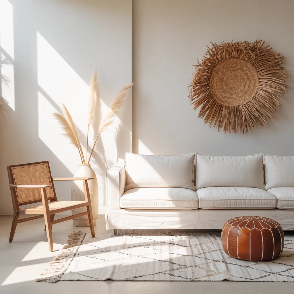 A light-filled living space exudes bohemian tranquility with a muted desert palette. An oversized white sofa with plush cushions takes center stage, grounded by a soft diamond-patterned area rug. Rustic textures abound, from the woven leather pouf to the wicker sun mirror adorning the wall. Natural materials like rattan chairs and dried pampas grass stems add organic warmth. The neutral color scheme allows warm terracotta accents like the wooden chair frame to softly harmonize, creating a serene yet soulful oasis for relaxation.