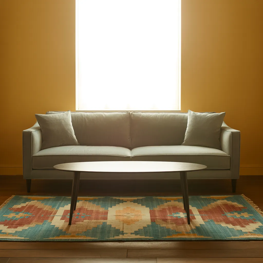 A plush taupe sofa with plump cushions takes center stage, complemented by a round espresso-toned coffee table. The warm earthy color palette is accentuated by a handwoven wool area rug featuring geometric southwestern patterns in terracotta, turquoise, and ochre tones. Clean lines and sleek wood legs lend a contemporary flair to the furniture pieces crafted from premium materials like leather and solid hardwood. The space exudes a cozy yet sophisticated ambiance, blending modern minimalism with rustic boho accents – a harmonious interior style suited for intimate living areas brimming with understated elegance and comfort.