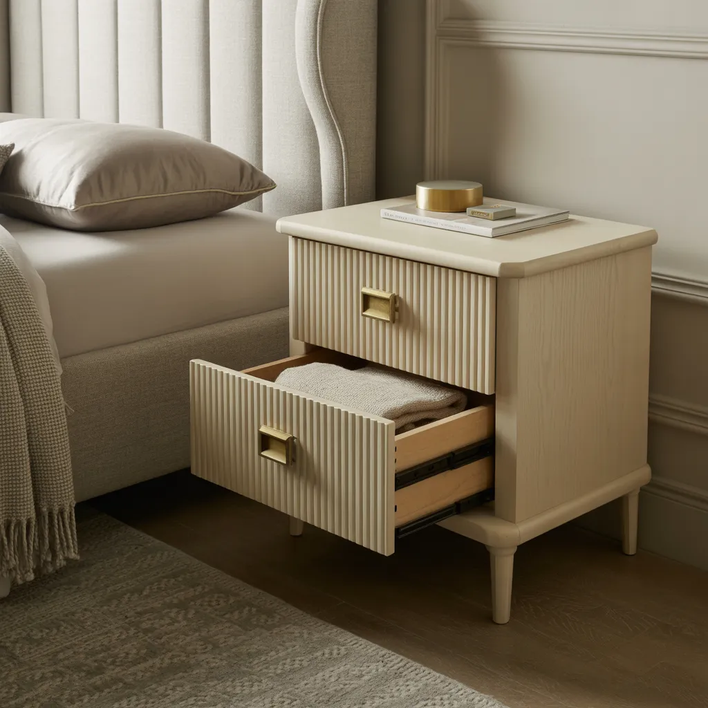A tailored bedside table with fluted detailing and brass hardware stands alongside an upholstered wingback bed, exemplifying a refined contemporary style. The pieces, crafted from solid oak wood and velvet upholstery, showcase a muted color palette of warm beiges and grays accented by metallic gold tones. The design maximizes storage through built-in drawers while exuding an elegant, space-conscious appeal ideal for smaller bedrooms. The understated furniture silhouettes and restrained material combinations create a sophisticated, uncluttered aesthetic suitable for compact urban living