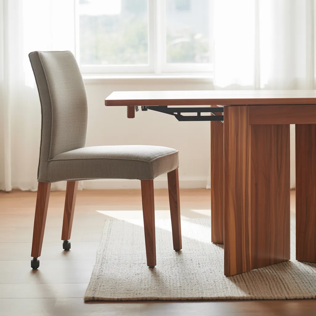 An upholstered dining chair with casters and a wooden extending table set the scene for a contemporary dining area. The chair features a tailored greyish upholstery with clean lines and a supportive back, while warm walnut wood tones lend natural elegance to the table’s slatted design. Metal hardware and casters add industrial accents. The table’s hidden butterfly leaf allows seamless expansion for hosting guests without dominating the space when closed. Ideal for urban apartments or small dining rooms seeking flexible, multifunctional furniture that balances style and practicality. The neutral palette with pops of warm wood creates an inviting yet modern aesthetic.